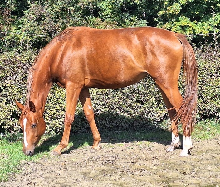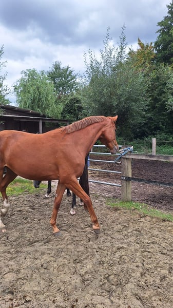 **Sales Advertisement: Beautiful Westphalian Mare for Sale** For sale is a Westphalian mare, born in 2022. This pretty chestnut mare stands at 157 cm. She has not yet been backed, as she was born at the end of June and is ideal as a pony transition horse. She is a very fine horse with a very good walk. She has never been sick, but a chip was diagnosed on her left hind leg during a random finding at a vet check, which does not cause any problems. Due to this finding, she is being sold well below value! She was born at our home and lives in a loose housing system in a mixed herd, but is also familiar with box housing. She is accustomed to dogs, trucks, tractors, etc. She impresses not only with her attractive color but also with her friendly and open nature. The mare is well-mannered, easy to handle, and shows a high willingness to learn. If you are interested or need further information, please feel free to contact me. Viewings are possible by arrangement. We look forward to your message!