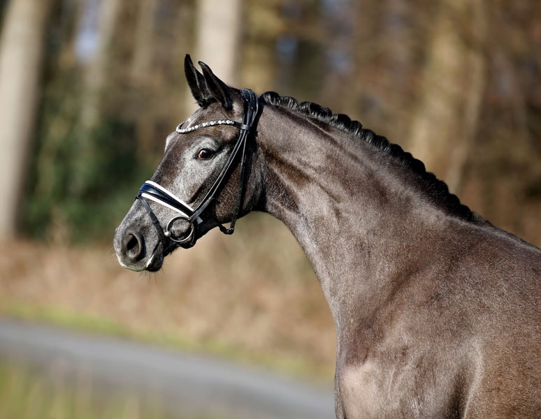 Traumhafte Rappschimmelstute mit dem Prädikat: Wertvoll!! Eine noch sehr junge , hochintelligente Dressurpüppi, die sich bereits mit nur sehr geringer Arbeit bestens präsentiert und auf Anhieb weiss, was Ihre Menschen möchten. Naturgegebene, ungezwungene Rittigkeit bei hervorragender Bewegungsqualität und bespielloser Konzentration nebst Lernfähigkeit. Eine ganz besondere, hochwertige Pferdepersönlichkeit für den begeisterten Liebhaber und Förderer. Noch voll in der Entwicklung stehendes Damenpferd aus pferdegerechter, grundsolider Aufzucht. Gute Röntgenbilder vorhanden.Auf Wunsch gerne zum Versand.