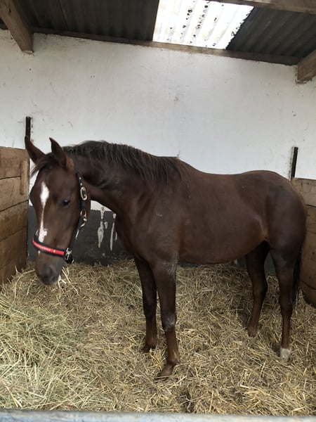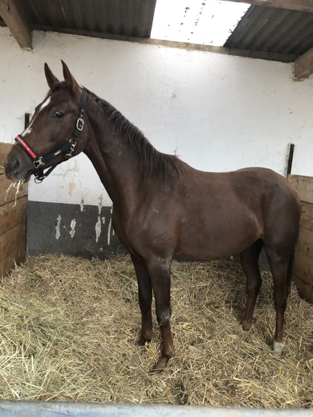 Top three-year-old dark chestnut mare with excellent movement. Friendly and gentle in handling, and performance-ready. She comes from top bloodlines, and her athletic potential is in the higher range.