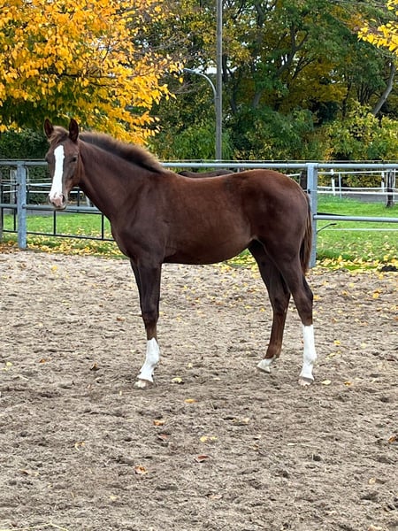 Due to the discontinuation of dressage sports For sale is a talented Westphalian mare with a lot of potential. This mare impresses not only with her appealing color and markings but also with her incredibly friendly nature and willingness to learn. She is ideally suited for ambitious riders who want to make a breakthrough in dressage. The mare already has basic knowledge under saddle and is well-behaved with people and other horses. If you are interested or need further information, I am happy to assist you. Home before price! I look forward to your message!