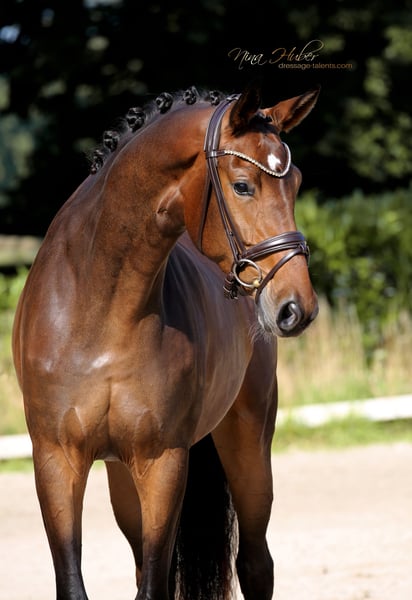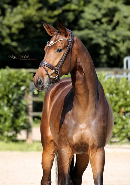 Best dressage blood in a unique combination. Wealthy daughter of San Amour from an excellent dam line. Highly noble and, despite having little work so far, beautifully rideable, with an impeccable character and demeanor. A still youthful dressage candidate, with plenty of undiscovered potential and talent that is definitely worth developing and promoting. Directly from the breeder. TÜV passed.