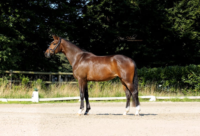 Beste dressuurbloed in unieke combinatie. Vermogende dochter van San Amour uit een geweldige moederlijn. Hoogstaand en ondanks tot nu toe weinig werk mooi te rijden, karaktervol en in de omgang onberispelijk en eenvoudig. Een nog jeugdige dressuurtalent, waarin nog veel onontdekt vermogen en talent sluimert, dat absoluut opgeleid en ontwikkeld moet worden. Direct van de fokker. Keuring goed.