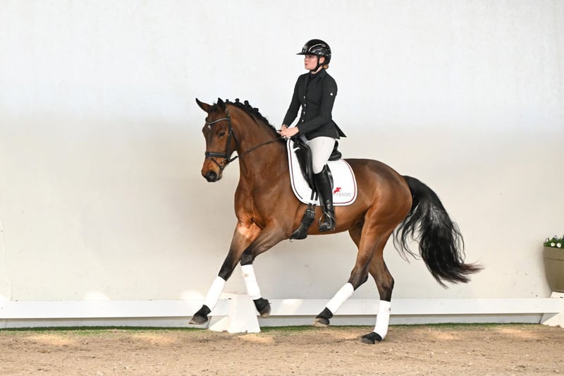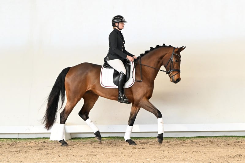 This charming four-year-old filly captivates with her friendly nature and natural calm, making her a true heart horse. With three solid gaits, refined handling, and a balanced temperament, she proves reliable and cooperative in her daily work. Still in the midst of her development, she has all the qualities to evolve into a modern top-level dressage horse. Her pedigree combines the finest lines of German dressage breeding: her sire, Sir Escolar, premium stallion and a prime example of elegance and quality, impresses with outstanding movement, spectacular trot, expansive walk, and expressive canter. The dam’s sire, Zoom, Westphalian dressage reserve champion, contributes excellent gaits, exceptional shoulder freedom, and swinging, ground-covering movement. Fürst Piccolo, as the dam’s dam sire, completes the pedigree, renowned for his remarkable character, outstanding offspring, and unmistakable dressage quality. This filly presents as a harmonious, willing-to-learn horse with natural self-carriage, uphill movement, and a rideability that makes every session effortless. From the first moment, she offers joy, confidence, and the chance for any rider to showcase her quality. A horse for those seeking a promising young dressage prospect with character, three strong gaits, and natural presence – ready to grow into a true champion.