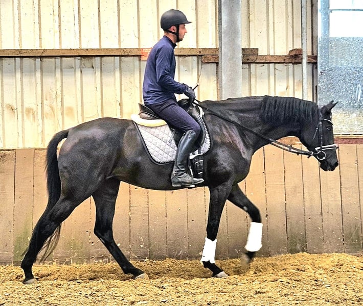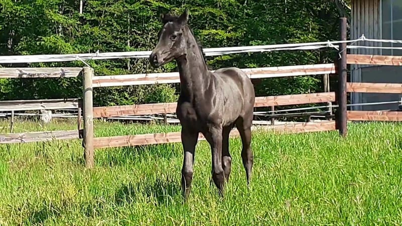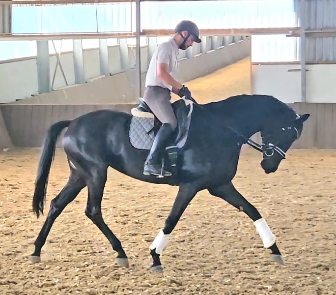 We are offering a beautiful black mare by Selectric. She has enormous movement and is a horse with potential for high-level sport. A mare through and through, she tests and needs a calm, consistent hand. Not suitable for beginners. Raised with love. Due to a finding, she is being sold well below value (more details upon request). Currently, she is turned out with a 4-year-old gelding and is being developed and lightly worked. She should be placed in nurturing, good hands.