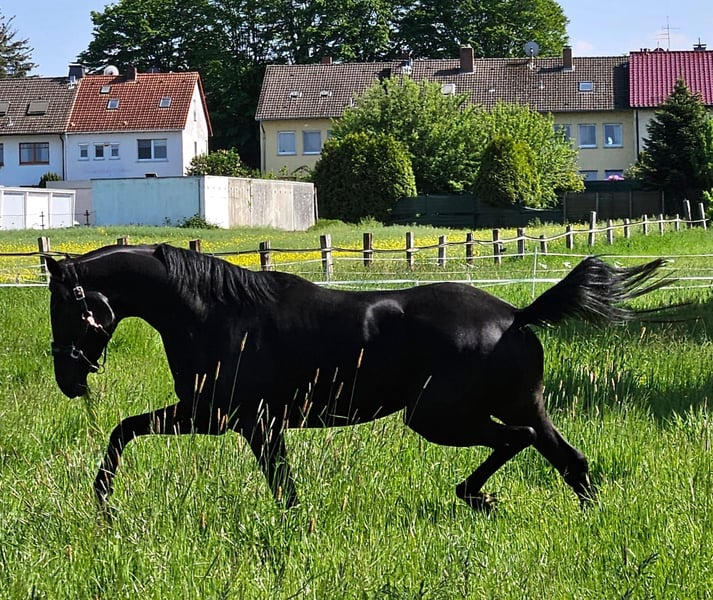 Bieten hier eine wunderschöne Rappstute von Selectric an. Sie hat enorme Bewegungsabläufe ein Pferd das Potenzial für den großen Sport hat. Eine Stute durch und durch testet und brauch eine ruhige konsequente Hand. Nichts für Anfänger. Mit Liebe groß gezogen. Aufgrund eines Befunds weit unter Wert zu verkaufen (genaueres auf Anfrage).Derzeit geht sie mit einem 4 jährigen Wallach zusammen auf die Wiese und wird kultiviert und leicht gearbeitet. Soll in fördernde gute Hände abgegeben werden.
