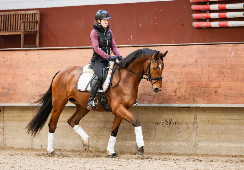 Suki is a promising dressage prospect with excellent movement dynamics and three outstanding basic gaits. She is energetic and forward-moving, with sensitivity and finesse in her aids, yet always well-behaved and completely free of spookiness or nervousness. She is rideable, seat-sound, and possesses the necessary 'speed' within her gait, despite her abundant momentum. Her hind leg is particularly impressive. Suki has already experienced the competition atmosphere and has placed in A-level dressage tests. She is completely unspoiled by her breeder and is ready for the big arena; further training will pay off and bring her much joy. Viewing and falling in love is highly recommended! A recent TÜV report from 01/2025 is available, including her neck, and Suki is EVCM-free.