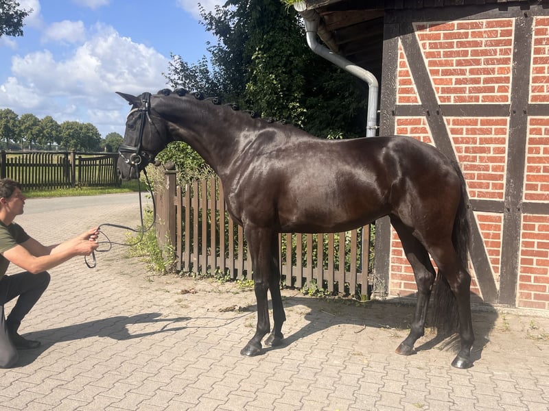 Beautiful 4-year-old black mare with current SLP. Trot: 8.5 Canter: 7.5 Walk: 8.0 Rideability: 8.0 The mare is sired by Vitalis-Hotline, comes from a breeder and is approximately 1.70m tall. She is very people-oriented and affectionate, knows free jumping, lunging, paddock, and pasture. She has grown up in a herd with peers. Has never been sick. She is ridden in the indoor arena, on the outdoor arena, or on the racetrack. Videos can be sent via WhatsApp if interested.