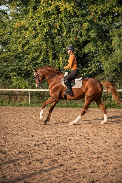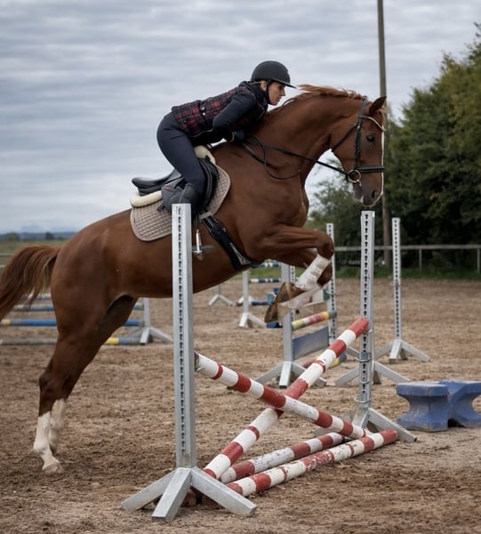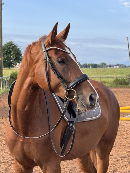 Beautiful dressage mare with heart ❤️, suitable for all disciplines! I am looking for a loving home for my stunning 5-year-old chestnut mare. She currently measures 16.1 hh. ❤️ Above-average basic gaits with great potential for future work in the arena, excellent hindquarter activity, well-ridden and easy to keep in contact ❤️ Talent and courage over fences! She has been trained and versatilely promoted by an eventing rider so far. Dressage: Basic level of dressage training (A level) Jumping: Can already do small E-level courses, but also jumps individual higher fences Well-behaved in the indoor arena, on the training ground, and in a group, including in the field. Recent X-rays of her back are excellent. She loads calmly, is very well-mannered with the farrier, and is a very affectionate and cuddly horse. She has been with me since her foal year and has not experienced any negative situations in her life. She was gently backed because she is quite tall. A horse that is eager for all adventures, she wants to go out and get started! However, she needs a rider with courage and confidence to build trust. She feels uncomfortable with nervous riders, so she is not suitable as a beginner's horse.