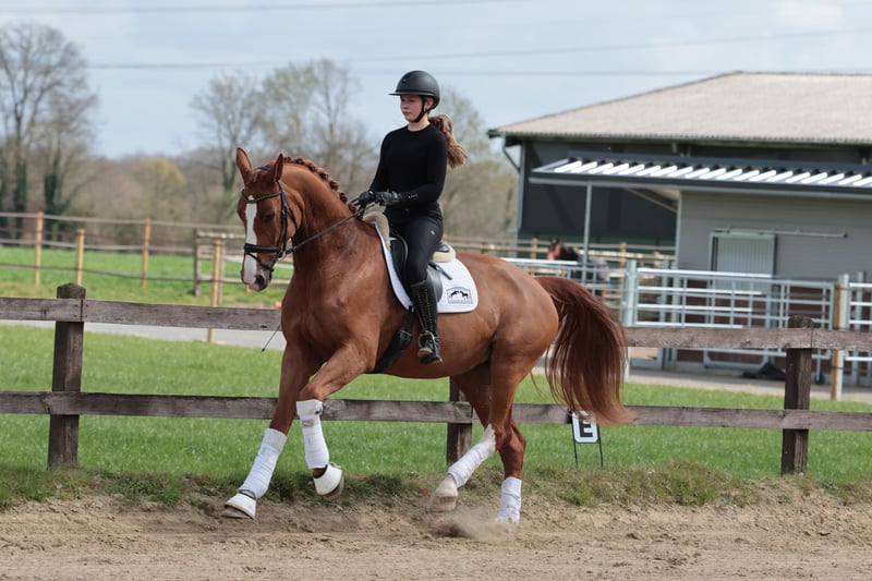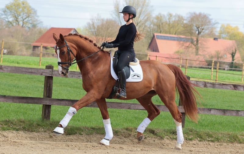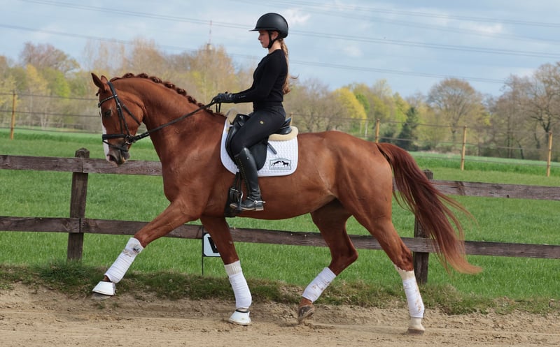 Diese wunderschöne Fuchsstute von Foundation x Rock For You kommt aus der eigenen Zucht und beeindruckt durch ihre ansprechende Erscheinung sowie ihre vielversprechende Grundausbildung. Sie ist bereits erfolgreich auf Turnieren vorgestellt worden und konnte A Dressuren gewinnen und sich in ihrer ersten Dressurpferde L platzieren. Ihr freundliches Wesen und ihre Bereitschaft, Neues zu lernen, machen sie zu einem angenehmen Partner im täglichen Training sowie bei Turnieren. For Sanda überzeugt durch ihre elegante Erscheinung, ihre gute Bewegungsqualität und ihre ausgeglichene Art. Sie ist bereit für die nächsten Schritte in ihrer sportlichen Karriere. Bei Interesse oder weiteren Fragen stehe ich gerne für eine Besichtigung und Probereiten zur Verfügung.