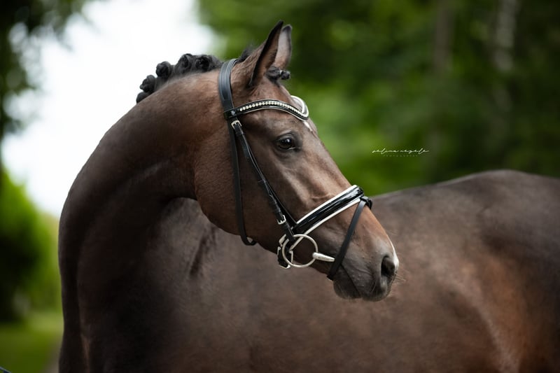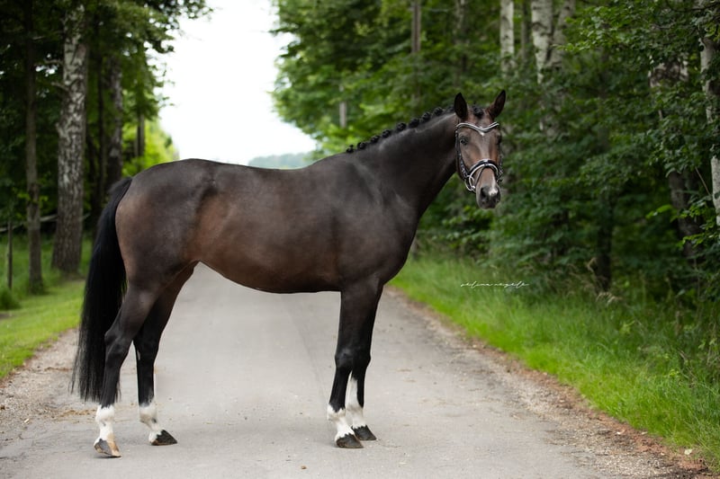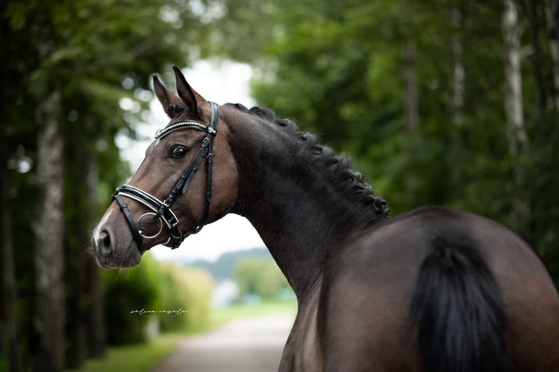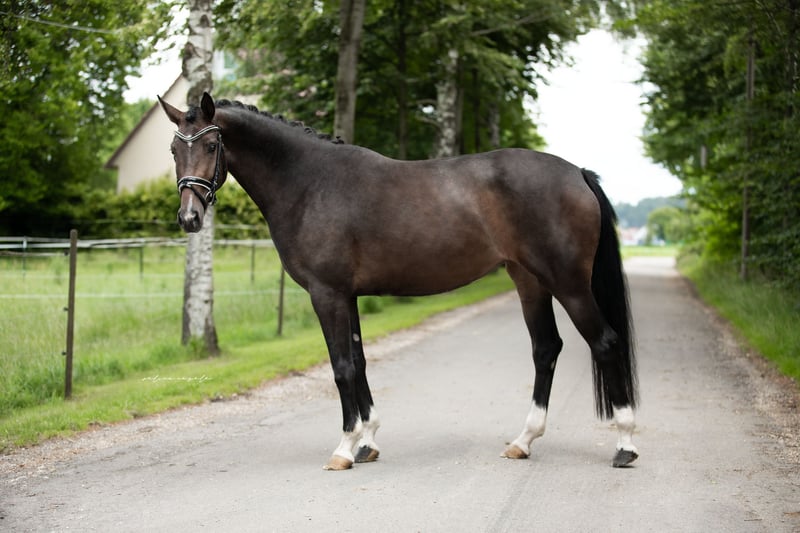 Elegante Westfale-Stute, geb. 2020, sucht ihren Dressurdeckel. Diese wunderschöne Dunkelbraune Westfale-Stute beeindruckt durch ihre elegante Erscheinung und ihr entspanntes Temperament. Mit einem Stockmaß von 165 cm bringt sie genügend Größe mit. Abgerundet wird ihr Typ durch einen kleinen Bauchfleck, der sie zu was ganz besonderem macht. Sie ist eine leicht zu reitende und vielseitige Dressurpartnerin, die durch ihre Lernbereitschaft und ihre positive Arbeitseinstellung besticht. Ihre solide Ausbildung bildet die perfekte Basis für eine erfolgreiche Zukunft im Dressurviereck. Auch Geländeausritte in der Gruppe oder alleine meistert Sie mit Bravour. Ist bei uns in der Herde groß geworden, 4jährig angeritten und hatte dann nochmals, aus Zeitgründen, eine Pause. Daher auch noch der relativ geringe Ausbildungsstand für ihr Alter. Wenn Sie auf der Suche nach einer talentierten und charmanten Dressurstute sind, die noch viel Potenzial mitbringt, könnte diese Lady genau die Richtige für Sie sein. Für weitere Informationen und eine Besichtigung stehe ich gerne ab 17:00h telefonisch zur Verfügung. Um dem Reittourismus entgegen zu wirken, erlauben wir uns eine Pauschale von 50,- zu erheben, welche bei Kaufabschluss angerechnet wird.