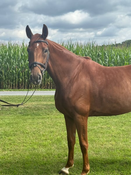 A 1.70 m, 6-year-old chestnut mare by Santo Domingo x Benetton Dream x Rohdiamant is available for sale. Saphira (as we call her) is a gentle mare with excellent rideability, very easy to ride, with good basic gaits, a natural forward movement, and a solid jumping technique with a well-controlled canter to the jump. She has been carefully trained by an amateur rider and has not yet been shown in competitions, as there were no ambitions in that direction. We are looking for a home where she will continue to be thoughtfully and lovingly supported. She is a horse that can bring joy in dressage, jumping, or even trail riding. An all-rounder with whom there is much to learn and from whom one can enjoy many shared experiences. She is being sold solely for private and health reasons of her owner. Good older X-rays are available. Saphira is familiar with dogs, cats, goats, pigs, tractors, and all other farm noises and equipment. She is herd-compatible, accustomed to daily turnout and lunging (weather permitting). Her character is affectionate, friendly, and people-oriented. She demonstrates a good work ethic. Over fences, she is honest, with good awareness and caution. She reliably completes small courses. She is a horse that wants to do everything correctly and to please in daily work. Due to her pedigree, solid foundation, attitude, character, and rideability, she could also become an interesting broodmare later on. A trial ride is possible at any time.