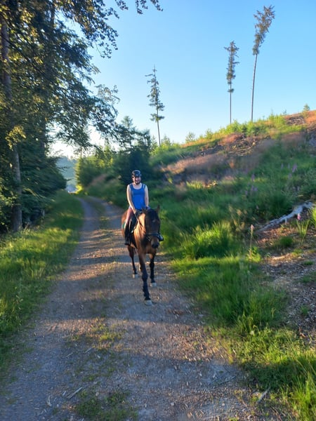 Cleo ist eine liebe und umgängliche Stute. Sie wird 2026 sieben Jahre alt und ist ca. 164cm groß. Mit 4 Jahren hatte sie ein sehr sportliches Fohlen von Classico's Champion. Sie hat mit nur 2 Besamungen aufgenommen. Die Trächtigkeit und die Geburt verliefen unkompliziert. Vater: Contendrix (unter Toni Hassmann bis 1,60m platziert) Muttervater: Cordynox (unter Marcus Ehning int. platziert) Ihr Halbbruder mütterlicherseits ist bereits bis Springpferde L und L-Springen platziert. Mit 5 Jahren wurde Cleo schonend angeritten. Sie geht allein und in der Gruppe ins Gelände und springt brav einen kleinen Parcours. Sie ist brav beim Schmied und beim Scheren. Sie ist verladefrom. Sie kennt sowohl Boxen- als auch Offenstallhaltung. Durch einen Weideunfall im Alter von 2 Jahren hat Cleo das rechte Auge verloren. Ich gebe Sie daher unter Wert ab. Sie kommt sehr gut damit zurecht. Cleo steht in 51647 Gummersbach und kann dort besichtigt und auch Probe geritten werden. Da ich jedoch Reittourismus aus Fairness gegenüber dem Pferd vermeiden möchte, nehme ich für ein Probereiten eine Gebühr von 10€. Bei Interesse oder für Fragen gerne Kontakt per ehorses oder per WhatsApp unter 01718008979. Cleo braucht einen festen Personenkreis und wird weder an Schulbetriebe noch an Händler abgegeben. Platz vor Preis!