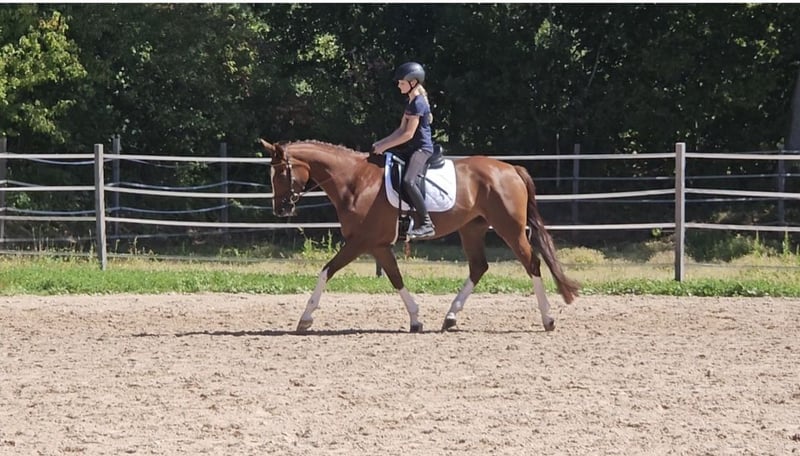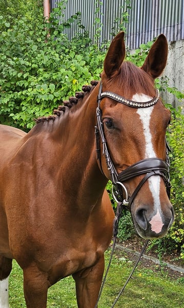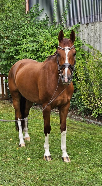 Su incarico dell'allevatore, vendiamo una cavalla westfaliana nata nel 2018 (De Beau x Feinsinn) con un'altezza al garrese di 1,68 m. La cavalla è stata montata una volta a quattro anni, ma la sua ulteriore formazione è stata posticipata a causa di circostanze di salute dell'allevatore. Questo le ha dato l'opportunità di maturare in tranquillità, sia fisicamente che mentalmente. Da circa 5 mesi viene nuovamente montata regolarmente e si presenta affidabile, attenta e desiderosa di apprendere. Anche una ragazza di 13 anni la monta senza problemi, nonostante il nostro vivace ambiente del club. Internamente al club è stata già provata come cavallo da volteggio, dove si è comportata bene. Nella stalla è cauta e diffidente, perciò ha bisogno di una persona di riferimento esperta che le dia calma e sicurezza. Con pazienza, riesce a fidarsi. Sella o a terra, non si percepisce la sua sensibilità. Nel terreno si comporta bene in ogni posizione – sia davanti, in mezzo o dietro – e anche da sola si mostra tranquilla e impavida. Cerchiamo per questa cavalla una persona con esperienza equina, che abbia piacere a continuare la sua formazione e a valorizzare le sue qualità.