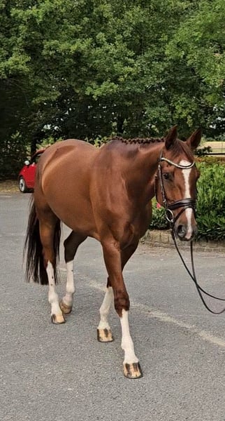 Im Auftrag des Züchters verkaufen wir eine 2018 geborene Westfälische Stute (De Beau x Feinsinn) mit einem Stockmaß von 1,68m. Die Stute wurde bereits mit 4 Jahren einmal angeritten, die weitere Ausbildung musste jedoch aufgrund gesundheitlicher Umstände des Züchters zurückgestellt werden. Dadurch hatte sie die Gelegenheit, in Ruhe zu reifen – körperlich wie geistig. Seit etwa 5 Monaten wird sie nun wieder regelmäßig geritten und zeigt sich dabei zuverlässig, aufmerksam und lernwillig. Auch ein 13-jähriges Mädchen reitet sie trotz unserer lebhaften Vereinsumgebung problemlos. Vereinsintern wurde sie bereits als Voltigierpferd ausprobiert, wo sie sich brav verhielt. In der Box ist sie vorsichtig und misstrauisch, weshalb sie eine erfahrene Bezugsperson braucht, die ihr Ruhe und Sicherheit gibt. Mit Geduld fasst sie Vertrauen. Unter dem Sattel oder in der Arbeit an der Hand merkt man von ihrer Sensibilität nichts. Im Gelände geht sie brav in jeder Position – ob vorne, in der Mitte oder hinten – und auch allein zeigt sie sich gelassen und unerschrocken. Wir suchen für diese Stute einen Menschen mit Pferdeerfahrung, der Freude daran hat, ein junges Pferd weiter auszubilden und ihre Qualitäten zu fördern.