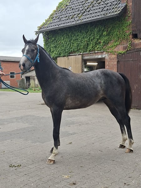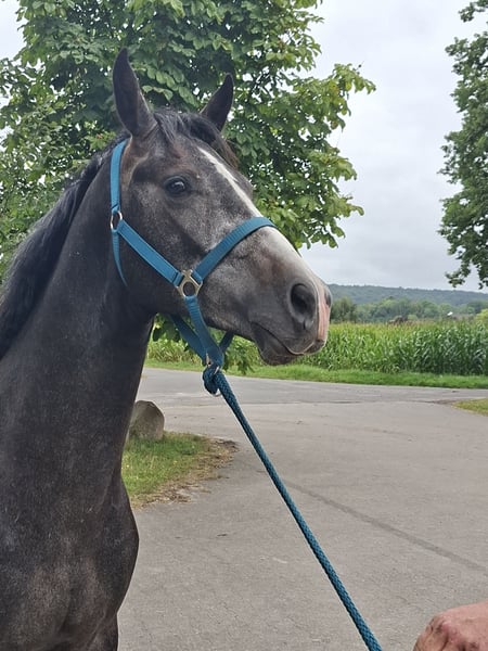 We are selling a approximately 1.63m tall 2.5-year-old young stallion with a lot of potential to become a good show jumper. He is currently living in a herd of young stallions with 6 other young stallions and has grown up here. He is well-behaved on the ground and can be haltered in the pasture and led out easily. You can tie him up and groom him without any problems. Additionally, he loads well. He has been regularly seen by the farrier and always receives good feed, as well as mineral supplements. If you are interested, please feel free to contact us at 015117670724. Best regards, Rita Bruns