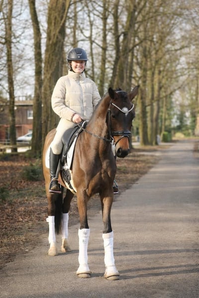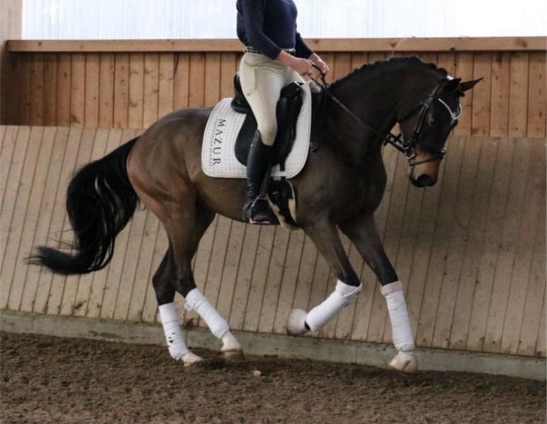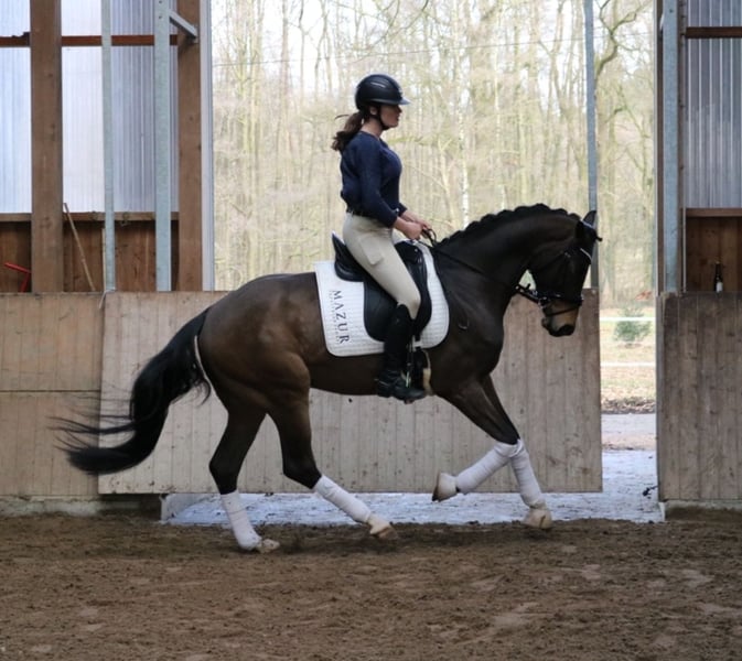 FLASH MICH - Franziskus x Fürst Frederick x Roboter. Sein Name ist Programm. Eigentlich wollten wir dieses Traumpferd behalten, doch aufgrund der Zeitintensivität unserer Kundenpferde, können wir ihm leider nicht so gerecht werden, wie wir es uns wünschen würden und so suchen wir nun schweren Herzens einen absoluten Bestplatz. Dieser selbstgezogene 5jährige Wallach bringt alles mit, was Dressurreiterherzen höher schlagen lässt. Der Charakter einer 12/10, drei mehr als überdurchschnittliche Grundgangarten, gepaart mit einer unglaublichen Leichtrittigkeit und schöner, als man ein Pferd malen könnte. Bereits als Fohlen hat er all unsere Erwartungen übertroffen, so wurde er Schausieger und vom westfälischen Pferdestammbuch mit der goldenen Fohlenprämie ausgezeichnet. Flash sollte im vorletzten Jahr auf der Sattelkörung vorgestellt werden, leider hat uns der Röntgen-TÜV einen Strich durch die Rechnung gemacht, da er einen Chip im Knie hat. Dieser ist operabel und macht ihm klinisch keinerlei Probleme. Dennoch würden wir ihn aufgrund dieser Diagnose „unter Wert“ in ein wertschätzendes Zuhause verkaufen. Flash wäre auch das ideale Pferd für Ponyumsteiger oder Wiedereinsteiger. Er ist absolut kopfklar, verzeiht jeden Fehler, macht jeden Quatsch mit und möchte immer gefallen. Jeder, der ihn bislang geritten ist, war überzeugt von ihm. Ein Youngster, der einfach Spaß macht.