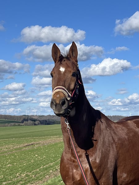 Für meinen schicken Fuchswallach, 10 Jahre, 170 cm, super Abstammung, sehr gute GGA, suche ich schweren Herzens ein liebevolles neues Zuhause, da ich ihm leider aus gesundheitlichen Gründen nicht mehr gerecht werden kann. Er ist ein tolles Pferd mit sehr viel Charme, absolut menschenbezogen und sehr anhänglich. brav im Umgang, beim Tierarzt und beim Hufschmied. Er ist gesund, TüV liegt vor, kann auf Wunsch aber gerne aktualisiert werden. Unterm Sattel ist er vielseitig einsetzbar. Dressurmäßig ist er momentan auf A-Niveau, jedoch bei entsprechender Förderung Potenzial für mehr. Ins Gelände geht er auch sehr gerne und liebt Bodenarbeit. Für meinen sympathischen Wallach wünsche ich mir ein liebevolles Zuhause mit viel Abwechslung und täglichem Koppelgang, sowie ein Reiter, der ihm Sicherheit bietet. Er ist kein Notverkauf und wird nur in allerbeste Hände abgegeben. Keine Händler oder Schulbetrieb! Bitte nur ernstgemeinte Anfragen. Probereiten nach Absprache möglich (die Gebühr in Höhe von 40,—€ wird bei Kauf angerechnet). Nähere Informationen gerne per Nachricht.