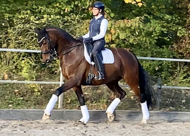 Vielseitiger Wallach mit Dressurschwerpunkt und top Gelände- und Springqualitäten Dieser charmante Wallach überzeugt durch solide dressurmäßige Ausbildung und Freude an abwechslungsreicher Arbeit. Stangen- und Cavalettiarbeit sowie kleine Sprünge machen ihm sehr viel Spaß; im Springen wurde er jedoch nicht weiter gefördert. Im Gelände zeigt er sich trittsicher und entspannt – ideal für gemütliche Ausritte, aber auch jederzeit bereit für einen flotten Galopp zu haben. Er kennt Arbeit an der Hand und wurde ursprünglich für den Westfälischen Zuchtverband als doppelveranlagter Hengst gekört. Aufgrund seiner Vorerfahrungen ist er kein Männerpferd und kein Turnierpferd – er benötigt einen feinfühligen, erfahrenen Reiter, der seine Qualitäten zu schätzen weiß. Perfekt geeignet für ambitionierte Freizeitreiter, die ein vielseitiges, leichtrittiges und sensibel reagierendes Pferd suchen und gerne abwechslungsreich arbeiten. Hinweis zur Haltung: Der Wallach ist Sommer wie Winter täglichen Koppelgang gewohnt. Diese Form der Haltung wünschen wir uns auch weiterhin für ihn, da sie ihm sehr guttut. Video auf Anfrage
