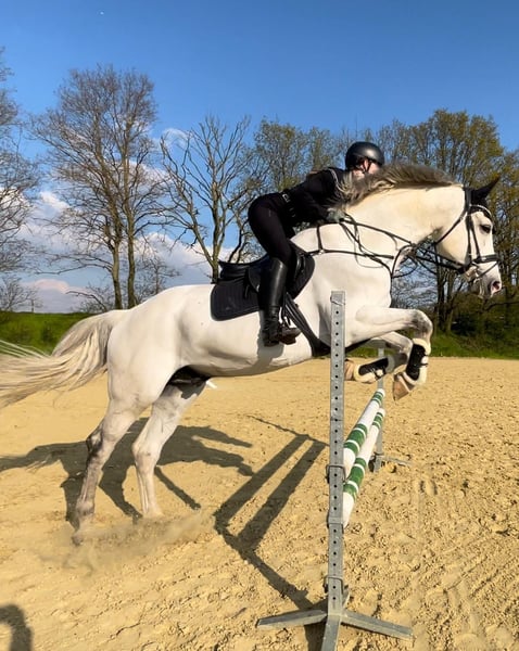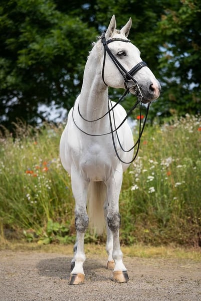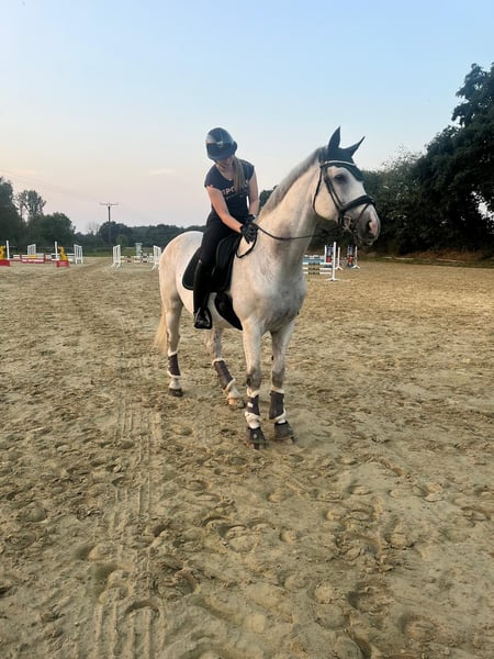 Westfalian grey gelding – loving leisure and jumping partner with charm Casanova is a 16-year-old Westphalian gelding (born January 24, 2009) with a height of approximately 170 cm. He is a very gentle, affectionate grey horse who enjoys human company and always presents himself in a friendly manner. Casanova was trained up to M* level by the breeder, then in the second hand up to L, and has mainly been ridden by me at A* to A** level. He easily handles individual jumps up to about 130/135 cm. He works with motivation, is familiar with ground work, dressage, lunging, double longe, jumping, hacks, and walks. Different riders pose no problem for him. In the field, he is well-behaved but a bit shy when ridden alone and feels much more comfortable in company, preferring to follow behind another horse. In dressage, he finds it difficult to maintain a consistent connection and to swing properly through the body, so he needs a sensitive and patient rider. In handling, Casanova is completely uncomplicated: he is used to being tied up on either side, both at the grooming area, in the stable aisle, and in the washbox. He clearly enjoys grooming, washing, clipping, and daily preparation. He is very well-behaved at the blacksmith and has always been shod with full shoes. On the pasture or paddock, he gets along well both alone and with other horses. He has shown no vices such as rearing, kicking, or bucking with me. He is generally healthy. Unfortunately, I can no longer ride due to an illness, so Casanova is looking for a new home. He will only be placed in good hands, but as a rule: location before price! Due to his age, Casanova is ideally suited as a reliable leisure partner who still enjoys participating in competitions and has always behaved well there. He is located in the Kleve district and is offered for €9,500 VB. Interested? Please contact us at +49 177 4635428. To prevent ride tourism, we charge €30 per trial ride, which will be credited upon purchase.