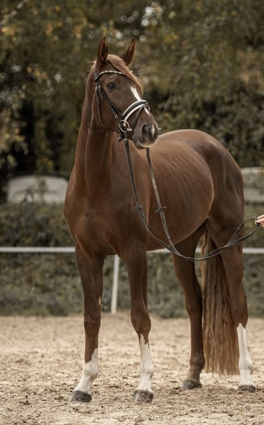 For sale is a particularly typey and expressive Westphalian gelding by Baccardis Best out of Fürst Romancier, in the stunning dark chestnut color. Born in 2022, he is now 3.5 years old and already stands at 16.1 hh. Mokka impresses with three outstanding gaits that leave nothing to be desired: a powerful, elevated trot, an uphill canter, and a spacious, ground-covering walk. His natural movement quality and talent already indicate a bright future in dressage. He is already performing flying changes on both sides, highlighting his excellent balance and eagerness to learn. Since mid-year, he has been gently backed and has already competed in two young horse classes, where he presented himself very confidently and calmly, earning scores above 7. For variety, he also jumps small cross rails and regularly participates in a weekly cavaletti session, which he approaches with great joy and composure. He is truly versatile and eager to please, happily doing anything he is asked. In handling and under saddle, he displays an ideal temperament – a true 10 out of 10! His mindset is mature beyond his years: always cool, reliable, and absolutely brave. Whether there are ten other horses in the arena, banners fluttering, or the colorful cones around, he remains calm and focused on his rider. He is also well-behaved and straightforward when hacking out, loading, or at competitions. Despite his age, he does not need to be lunged before riding and has never taken a false step under saddle. A young gelding with excellent conformation, a big heart, and above-average movement quality – a horse that brings joy every day and promises a bright future in dressage. X-rays of the neck and back are available without any findings. He will only be sold into the best hands. Please note: a €30 fee will be charged for trial riding, as we do not support riding tourism.