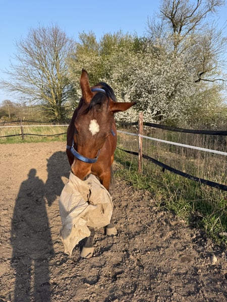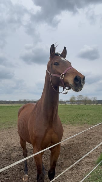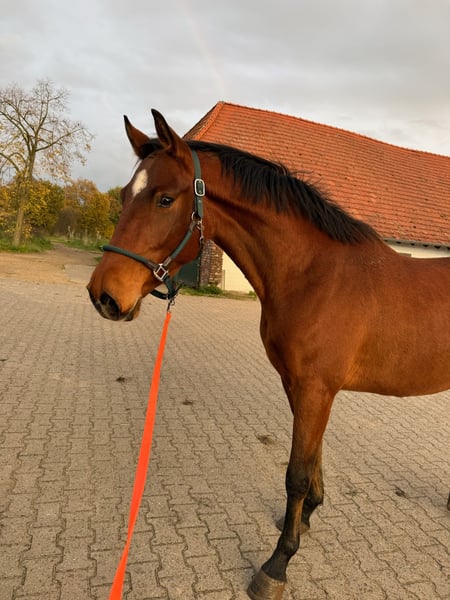 Für meinen jungen Wallach Bilbo, einen Sohn von Benicio, suche ich ein passendes neues Zuhause. Bilbo wurde über den Winter schonend und in seinem eigenen Tempo angeritten. Dabei wurde er auf dem Reitplatz in Schritt und Trab geritten, vereinzelt auch bereits angalloppiert. Er steht insgesamt noch am Anfang seiner Ausbildung und ist daher kein Pferd, mit dem man direkt aufs Turnier fahren kann. Seit Mitte Februar ist er wieder zurück am Stall und wurde aufgrund fehlender Trainingsmöglichkeiten sowie aus gesundheitlichen Gründen meinerseits überwiegend vom Boden aus gearbeitet, mal im Schritt geritten und viel spazieren geführt. Dabei ist er immer motiviert, lernwillig und macht insbesondere bei der Freiarbeit einfach Spaß. Bilbo ist ein sehr menschenbezogener, lieber junger Wallach, der mit seiner lustigen Art schnell begeistert. Er lernt neue Dinge schnell und arbeitet gern mit. So hat er zum Beispiel das Flehmen auf Kommando sehr schnell verstanden und kennt es auch, sich an der Aufstiegshilfe einparken zu lassen. Für Quatsch ist er immer zu haben, egal ob beim spielen mit einer Plastik Tüte oder einem Gymnastik Ball, er zeigt sich dabei bisher aufgeschlossen, neugierig und unerschrocken. Auch hab ich ihn schon mit zur Arbeit genommen, wo er sich ganz entspannt alles angeschaut hat. Auch im Umgang zeigt er sich angenehm. Selbst in Schreckmomenten war er bisher immer gut händelbar und hat sich noch nie losgerissen. Natürlich zeigt er weder beim Putzen noch beim Hufe auskratzen oder Mähne einsprühen irgendwelche Unarten, sondern ist auch da einfach lieb. Auch wenn mehrere Leute und Hunde um ihn rum wuseln, bringt ihn dass nicht aus der Ruhe. Er kennt Boxenhaltung, Offenstall sowie 24/7-Weidehaltung und ist außerdem hundeerprobt. Er ist regelmäßig beim Hufschmied, geimpft, war beim Zahnarzt, lässt sich auf einen Anhänger ohne Klappe gut verladen und läuft problemlos barhuf. In der Herde ist er eher rangniedrig. Bilbo durfte im alten Stall auch bereits einmal freispringen und hat dabei eine gute Figur gemacht. Er ist ein Pferd, das etwas tun möchte, seine Energie loswerden muss und Beschäftigung braucht. Ich wünsche mir daher einen Platz mit viel Bewegung, Auslauf und passender Förderung für ihn. Da er höufig noch etwas unsicher ist, braucht er einen Menschen, der ihm Sicherheit, Geduld und Ruhe gibt und ihn weiter ausbildet. Der Verkauf fällt mir nicht leicht. Er erfolgt ausschließlich, weil Bilbo mit seinem Schwung und seiner Energie ein Pferd ist, dem ich mit meinem gesundheitlichen Hintergrund langfristig nicht gerecht werden kann. Videos vom Reiten sind selbstverständlich vorhanden. Im Umkreis von 200km würde ich ihn auch in sein neues Zuhause bringen, wenn das gewünscht ist.