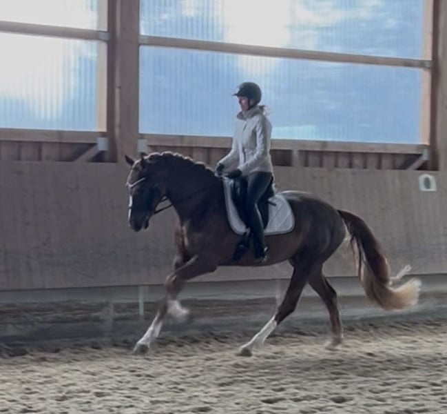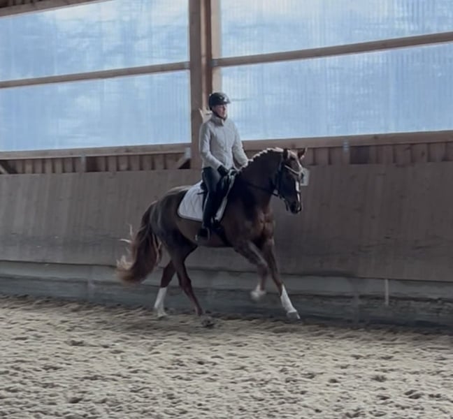 Zum Verkauf steht ein vierjähriger Dunkelfuchs aus westfälischer Zucht, abstammend von Bacardi’s Best x Fürst Romancier. Er ist ca 1,72 groß Mokka verfügt über drei sehr gute Grundgangarten, besonders hervorzuheben ist sein schwungvoller, taktsicherer Trab mit viel Elastizität. Er wurde im letzten Jahr schonend angeritten und anschließend bereits in zwei Reitpferdeprüfungen mit guten WN vorgestellt. Nach einem bewusst ruhigeren Winterprogramm wird er aktuell wieder altersgerecht und kontinuierlich gearbeitet. Charakterlich ist er absolut überragend: • sehr brav beim Reiten und im täglichen Umgang • äußerst menschenbezogen, liebt Kuscheleinheiten • auf Turnier extrem gelassen und unkompliziert • verlade- und schmiedefromm • komplett schrecklos, auch bei Traktoren, landwirtschaftlichen Maschinen und sonstigen Umweltreizen Im Sommer war er regelmäßig ausreiten und spazieren, was er stets entspannt und souverän gemeistert hat. Röntgenbilder liegen ohne Befund vor. Ein toller junger Dressurnachwuchs mit bestem Charakter, ideal für Sport und ambitionierte Reiter, die ein ehrliches, nervenstarkes Pferd suchen. Platz vor Preis Für das Probereiten wird eine Pauschale von 30 € erhoben, da wir keinen Reittourismus unterstützen.