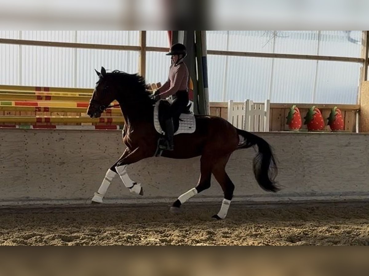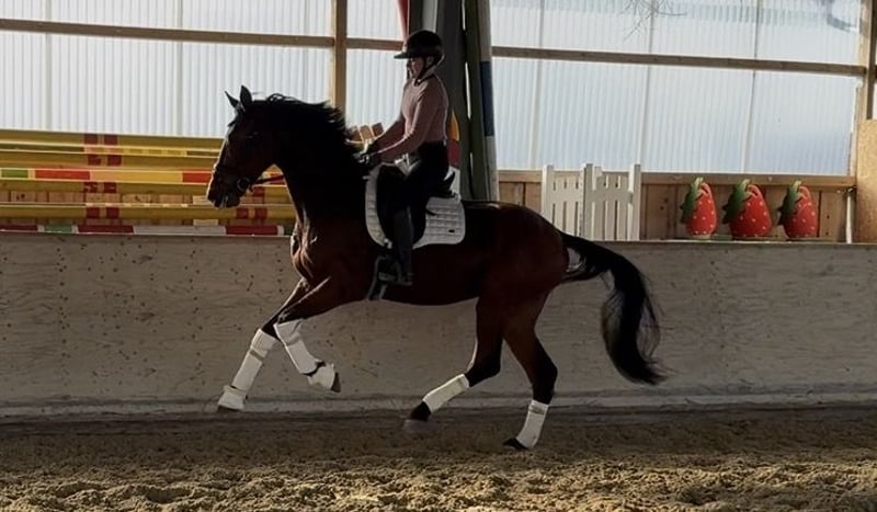 This tall, dark bay gelding impresses with solid basic qualities and a very pleasant, rideable temperament. His excellent canter and expressive trot are particularly noteworthy – he already shows a high level of quality in these gaits. He is still at the beginning of his development and needs time to grow physically into his frame, as well as to build muscle and substance. With patience and targeted training, he has the potential to develop into a highly promising young horse with great prospects. Temperamentally, he is an absolute sweetheart: very gentle, people-oriented, and completely straightforward in daily handling. He also behaved impeccably during his first farrier visit. He maintains a positive attitude and always wants to do his best. Thanks to his size and strong back, he is also ideally suited for larger or somewhat heavier riders. At the same time, he is so well-behaved and easy to ride that he is perfect for the ambitious leisure rider as well – trail riding and relaxed hacking are no problem at all. A horse with a very solid foundation, lots of quality, and a wonderful character – an excellent choice for both competitive riders and leisure riders alike. 📍 Location: Rosenheim Feel free to browse our other horses for sale – perhaps you will find the perfect match among them.