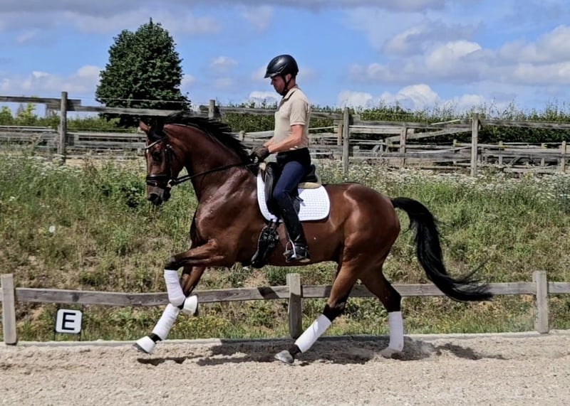 Bom Dia ist ein 5 Jähriger unverbrauchter und gut und gesund aufgewachsener Wallach der direkt vom Züchter verkauft wird. Er 4 jährig angeritten worden, dann aber nochmal auf die Wiese gegangen mit Kumpels und seit Frühjahr dieses Jahres unter dem Sattel. Er hat drei gute GGA wobei der Galopp besonders hervorzuheben ist. Er ist auch auf dem Turnier sehr artig und hat bei seinem zweiten Turnierstart direkt Dressurpferde A gewonnen. Seine Großmutter ist bei uns schon erfolgreich bis zur Klasse S gegangen und seine Mutter besticht durch bergauf und Rittigkeit welche sie ihm deutlich mitgegeben hat. Wir suchen ein tolles und förderndes zuhause für ihn. Er hat auch einen sehr gute Tüv inkl. Hals, Rücken etc
