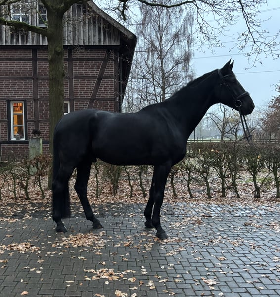 Scottish Peat – a jet-black giant with a heart of gold Scotty is an impressive, large-framed gelding with genuine presence – a horse that quickly captures your heart. Despite his XXL size, he is very sensitive to riding aids, easy to handle, and always fair in his dealings. He comes directly from the breeder and is a son of the Hanoverian dressage champion Spökenkieker, from a highly successful dam line. A recent X-ray examination is available, and he has a clean radiological report, including a discount due to vocal cord correction. Sportingly, Scotty has already proven himself: multiple high placements in young horse classes and A-level dressage competitions. Currently, he is in L-level training and already knows extended trot, simple changes, and short turns – always motivated, honest, and eager to learn. Scotty loves variety: hacking (absolutely trail-safe), pole work, jumping, free jumping, ground work, or simply cuddling – he’s up for any activity and always enthusiastic. His gentle, loving nature makes him a very special partner who strives to please his rider. An extraordinary, jet-black dressage prospect with a lot of heart, quality, and potential – ideal for riders seeking a large horse with a big character.