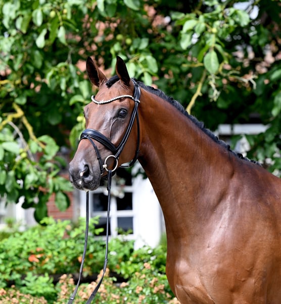 Bon Jovi is equipped with a spectacular trot mechanism and can be shown immediately in the Dressage Horse Class L. The path towards Class M is paved, and this horse has the potential for the big arena in the future. He is always friendly, sweet in handling, and wants to please his rider. For more information, please feel free to call +49 1577 7200270.