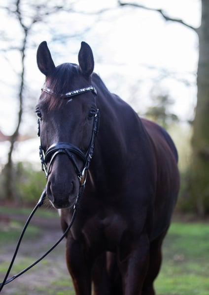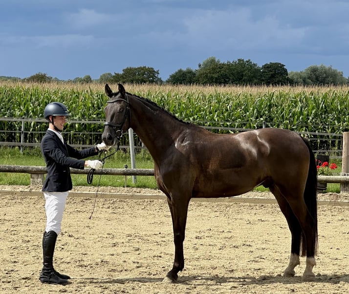 Talentierter 7jähr. Dunkelfuchs Wallach von Sir Heinrich x Florestano, mehrfach L platziert, M Dressurpferde fertig Zum Verkauf steht ein 7-jähriger Dunkelfuchs-Wallach, der mit drei sehr guten Grundgangarten, viel Elastizität und einer positiven Arbeitseinstellung überzeugt. Scallywag („der kleine Lausbub“) stammt direkt aus Züchterhand und wurde schonend und altersgerecht von einem Amateur ausgebildet. Mit seinen ausdrucksstarken Bewegungsablauf und seiner natürlichen Präsenz weiß er sich im Viereck bestens zu präsentieren – ein Showman, der stets die Blicke auf sich zieht. Entsprechend konnte er sich bereits in Dressurpferdeprüfungen der Klasse A und L gegen starke Konkurrenz und in L-Dressuren platzieren. Sein jetziger Ausbildungsstand bietet eine schöne Perspektive für die weitere Förderung, aktuell ist er Dressurpferde M fertig. Im Rahmen seiner vielseitigen Ausbildung zeigt er zudem Vermögen am Sprung, welches bislang nicht weiter gefördert wurde, und kennt Ausritte und Doppellongenarbeit. Auch hier überzeugt er durch seine Rittigkeit und positive Arbeitseinstellung. Mit seinem Stockmass von 169 cm und seinem kompakten sportlichen Format eignet sich Scally perfekt für ein sportambitionierten Reiter, der ein talentiertes Nachwuchspferd für die weitere Ausbildung sucht. Scally ist und war stets gesund, nie lahm oder ähnliches. Ein aktueller Röntgen TÜV incl. Rücken liegt vor. Hier zeigte sich ein tierärztlicher Zufallsbefund (minimaler Engstand im BWS-Bereich) der bislang zu keiner Symptomatik geführt hat. Aus diesem Grund geben wir ihn unter Wert ab. Für unseren ehrlichen und talentierten Wallach wünschen wir uns ein liebevolles Zuhause, in dem sein Potential gefördert und seine sympathische Art geschätzt wird. Bei ernsthaftem Interesse oder weiteren Fragen freue ich mich von Ihnen zu hören.