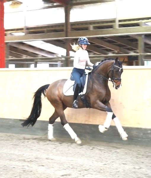 Flacon is a stunning son of For Romance. He was licensed in 2022/23 at the Westphalian Stallion Licensing and now leads an active life as a gelding. Under saddle, he impresses with his quality, rideability, and a very positive attitude towards work. Currently, he comfortably performs at Medium level in dressage and is being gently introduced to S-level movements. A very typey, expressive gelding who leaves no wishes unfulfilled. In daily handling and within the herd, he is absolutely well-behaved, uncomplicated, and reliable. No emails, only phone calls. Price plus VAT. Information without guarantee.