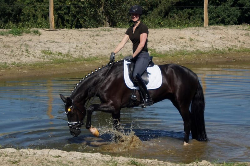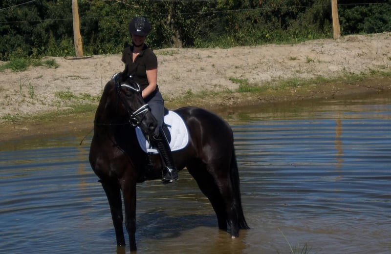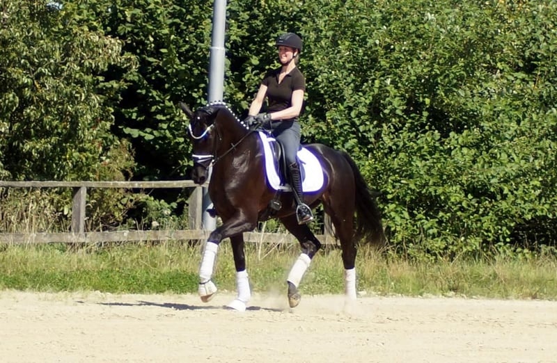 Fiorino is a top-class dressage horse that enjoys what humans offer him. Equipped with exceptional basic gaits, this strikingly beautiful gelding draws many eyes. His walk is large and very efficient. In the trot, he has a good hind leg that translates into expression and mechanics with plenty of shoulder freedom. His canter is maximally constructed uphill and gains significant importance from the enormous shoulder freedom. Personally, he is completely indifferent to this. He is only surprised by the many spectators, as he enjoys it when the rider fiddles with him, new tasks arise, or he simply gets to experience something. His riding reflects much of the Fürstenball bloodline. The way he moves softly and dynamically with a very pleasant contact can be attributed to his sire, Finest (by Fürstenball). Through the maternal line, which is also known for its jumping performance, he inherits a good physique with strong hind legs and a willingness to perform. Overall, one would today describe him as an expressive, extremely likeable "triple gaited" horse (three good basic gaits), whose future looks very promising due to a successful genetic foundation. A good TÜV from May 2025 is available.