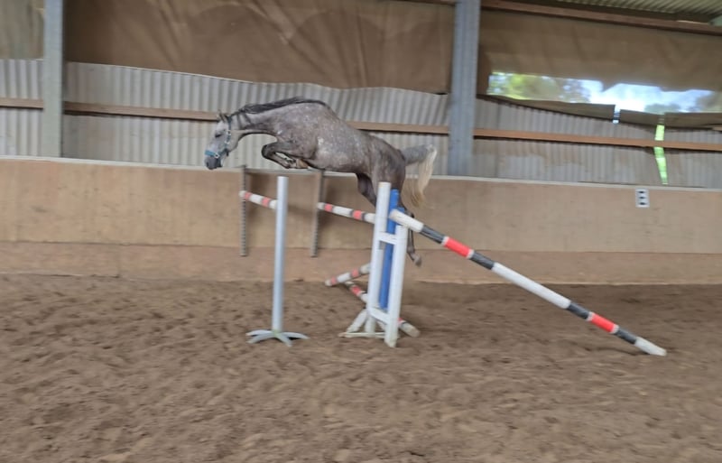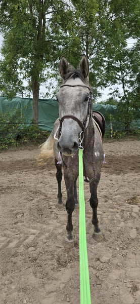 Constract is a 17.8 hh grey gelding by Contact Me * Stakkato * Lemonn ××. His dam is full sister to the German champion and the successful "Souvenir" with over 160 wins. He was given ample time to grow due to his size. Since summer 2025, he has been competing in sport, with multiple placements in jumping classes up to A** level. He reliably performs flying changes and is incredibly talented. In the terrain, he is very brave and confident. He has been in my possession since weaning. Healthy, with recent dental work and excellent hooves. Location: Paderborn. Please feel free to contact me at 0176 70349915.