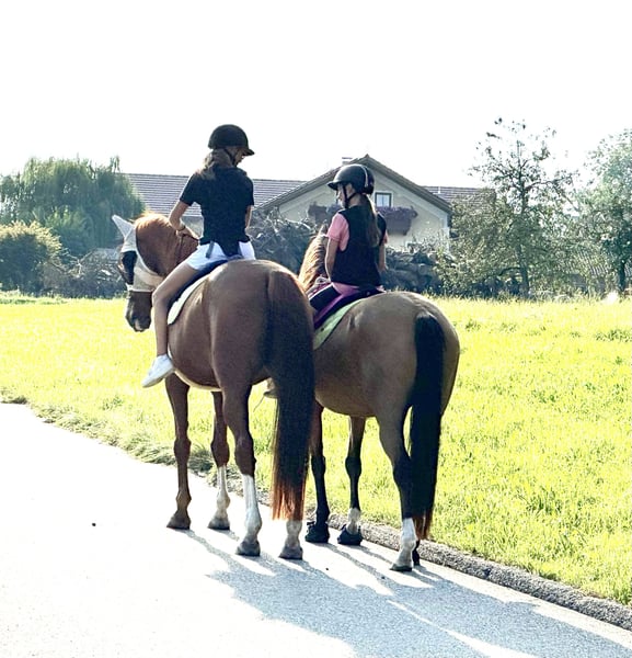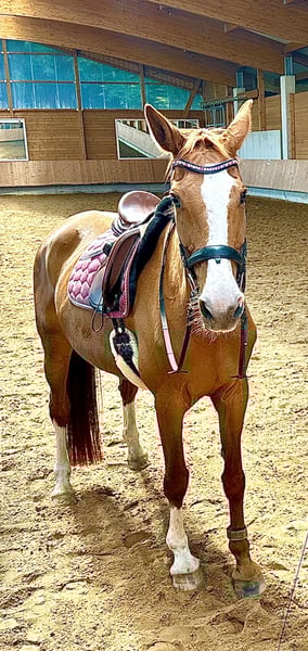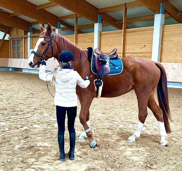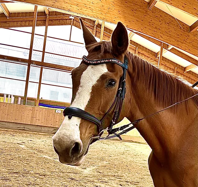 Für unsere liebevolle, stabile Warmblutstute Livinia (Livi) suchen wir ein neues, liebevolles Zuhause. Livi ist eine 18-jährige Fuchsstute mit 1,74 m Stockmaß. Sie ist ein absolutes Verlasspferd, das sowohl im Gelände als auch in der Halle eine echte Freude ist. Sie ist sofort reitbar, brav, ausgeglichen und hört hervorragend auf ihre Reiter*innen. Charakter & Umgang Livi ist eines dieser Pferde, die immer gefallen möchten. Sie ist freundlich, zugewandt, unkompliziert im Umgang und zeigt sich stets höflich und zuverlässig — egal ob beim Putzen, Satteln, Hufe geben oder Reiten. Ausbildung & Einsatzbereich Livi ist sehr gut ausgebildet: - solide Dressurarbeit (Seitengänge macht sie zuverlässig, saubere Übergänge, Leicht abrufbarer Galopp, taktreine Gänge) - sicher beim Springen bis ca. 1 m - absolut brav und zuverlässig im Gelände Damit ist sie ideal für: - Freizeitreiter*innen mit Anspruch - Wiedereinsteiger - Reiter*innen, die ein wirklich verlässliches Pferd suchen - Menschen, die ein Pferd möchten, das ihnen Sicherheit gibt Gesundheit & Haltung Livi ist gesundheitlich in einem sehr guten Zustand, regelmäßig geimpft und entwurmt. Sie wird kontinuierlich geritten und gepflegt – völlig einsatzbereit. Was wir suchen Für Livi wünschen wir uns ein wertschätzendes Zuhause. Uns ist ein guter Platz wesentlich wichtiger als der Preis. Besichtigung Kennenlernen und Probereiten sind nach Absprache jederzeit möglich. Preisvorstellung: 5.000 € VB – ein gutes Zuhause ist uns wichtiger als der Preis. Livi wird nur in beste Hände abgegeben.