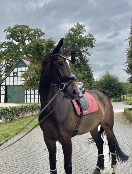This 8-year-old tall and elegant mare by Bon Coeur x Iberio impresses not only with her exceptional rideability and quality but also with her strong nerves and balance. In daily work, she is extremely pleasant and easy to ride despite her size. She is always motivated, clear-headed, and absolutely uncomplicated in daily handling – whether grooming, saddling, or loading. In sports, she has won up to M-level dressage and is on the direct path to S-level. She already masters the first S-level exercises confidently. At competitions, she always presents herself as focused, willing to perform, and strong-minded. Suitable for ambitious amateurs or professionals looking for a modern and performance-oriented sport horse with three above-average basic gaits that still has a lot of potential for higher tasks.