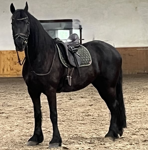 Zum Verkauf steht eine wunderschöne Friesenstute aus dem Jahr 2011. Sie ist eine elegante, typvolle Stute mit einem Stockmaß von 161 cm und deckt damit auch größere Reiter sehr gut ab. Die Stute eignet sich hervorragend für die Freizeit und den leichten Dressursport. Sie ist im Stutbuch I des FPZV eingetragen und hat die 2. Staatsprämie. Die charmante Stute besticht durch ihr einnehmendes Wesen, ist bestens erzogen, absolut brav und verschmust im Umgang und hat ein sanftes, ruhiges Temperament. Das macht sie zu einer idealen Partnerin für Ausritte und entspannte Stunden im Gelände – allein und in der Gruppe. Hier ist sie sehr leicht handelbar und gut als Familienpferd (vielleicht für Eltern & Kinder) geeignet. Bocken, Steigen oder unkontrolliertes Loslaufen sind ihr unbekannt - auch wenn sie längere Zeit nicht gearbeitet wird. Sie ist auf A-Niveau ausgebildet, wurde aber aus Zeitgründen von mir nur selten auf Turnieren vorgestellt. Unter einem einfühlsamen, erfahrenen Reiter, der sie mit freundlicher Konsequenz abwechslungsreich weiter fördert und fordert, zeigt sie hier gerne ihr Können. Auf Turnieren zeigt sie sich stets entspannt und konzentriert, fremde Umgebungen, Menschen und Musik stören sie nicht. Die Stute kennt Longieren, Bodenarbeit und schätzt Stangentraining bis hin zu kleinen Sprüngen. Sie ist 100% verkehrssicher, egal, ob Busse, Landmaschinen, Züge oder Menschansammlungen - sie bleibt ruhig. Sie wird regelmäßig gearbeitet (Dressur; Gelände; Stangen- und Bodenarbeit; Longe) und könnte sofort weitergearbeitet werden. Sie ist sehr gut sozialisiert und versteht sich sehr gut mit anderen Pferden. In der Herde ist sie eher zurückhaltend, aber immer sehr gut integriert und kennt sowohl 24/7-Weidehaltung als auch die Kombination aus Weide- und Boxenhaltung. Wenn Sie auf der Suche nach Ihrem Herzenspferd, einem treuen Begleiterin für gemeinsame Freizeitaktivitäten oder einem neuen Familienmitglied sind - dann ist diese wunderschöne Friesenstute genau das Richtige für Sie! Ihr Verkauf ist kein Notverkauf, sondern geschieht nach reiflicher Überlegung aufgrund einer neuen persönlichen Lebenssituation. Aus diesem Grund entscheidet hier Platz vor Preis. Achtung: Die Stute ist kein Gewichtsträger! Bei Interesse oder für weitere Informationen melden Sie sich gerne. Ich freue mich auf Ihre Nachricht!