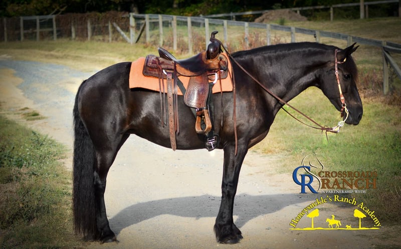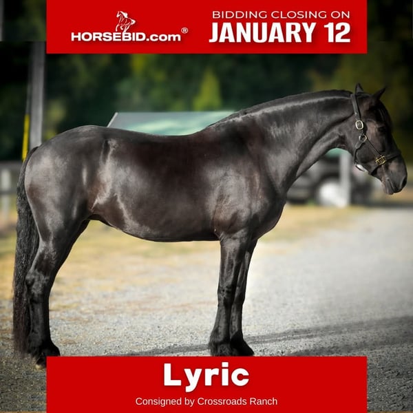 ♦️𝐍𝐄𝐖 𝐘𝐄𝐀𝐑'𝐒 𝑬𝒙𝒕𝒓𝒂𝒗𝒂𝒈𝒂𝒏𝒛𝒂♦️ Happening now thru MONDAY | JANUARY 12th - Available EXCLUSIVELY on HorseBid's website! For more details and to register visit: www.Horsebid.com CONSIGNOR CONTACT: Crossroads Ranch 704-617-6177 LOCATION: Monroe, NC BREED: Friesian Sport Horse REGISTERED: Yes REGISTERED NAME: Zoe Girl COLOR: Black HEIGHT: 15.3-16.00 hands AGE: 15 GENDER: Mare Lyric is a stunning, seasoned, and genuinely versatile mare with a depth of experience both under saddle and in harness. She has been thoughtfully trained and proven across multiple disciplines, making her a wonderful choice for someone who wants a capable, experienced partner rather than a one lane horse. Under saddle, Lyric is a beautiful mover, she's comfortable, and is solid and reliable, especially on the trail where she is confident, steady, and sensible. She is comfortable with water crossings, varied terrain, and obstacle work and approaches new situations with a calm, willing attitude. She excels in Western Dressage with scores in the 70s and performs extremely well at shows, showing correctness, responsiveness, and pride in her work. Lyric has also been fox hunted by both a 12 year old child and an amateur adult, works cows, and swims in the lake. Her versatility reflects not only her training, but her kind, adaptable mindset. What truly sets Lyric apart is her personality. She is extremely sweet, affectionate, and people focused. She enjoys connection, seeks out her person, and is happiest spending time with those she trusts, whether that is during grooming, quiet moments in the barn aisle, or simply being together. She is soft natured and attentive and takes comfort in routine and familiar faces. Lyric genuinely wants a relationship with her person and forms strong bonds. Her kindness does not mean she is dull. Under saddle she is engaged and responsive, while on the ground she is gentle, loving, and easy to be around. She is the kind of horse who takes pride in her job and enjoys having a purpose. Lyric is also broke to drive and works comfortably in harness, bringing the same steady, prepared attitude to driving that she does under saddle. This versatility makes her a wonderful option for someone who enjoys variety. She is well handled and accustomed to routine barn life. She loads, ties, and stands quietly for grooming, veterinary, and farrier care and has been thoughtfully maintained. Lyric is an easy keeper, does not require shoes, stays fit on reasonable feed, and prefers living outside full time. She is also easily bred and would make an exceptional broodmare. Lyric is best suited for an intermediate to confident rider who appreciates a well trained, responsive horse. She is not recommended for true beginners, but she is a wonderful partner for someone who rides with feel and consistency. Lyric offers rare versatility, proven experience, and maturity. Horses like her, with both a kind heart and a capable mind, are becoming harder and harder to find.