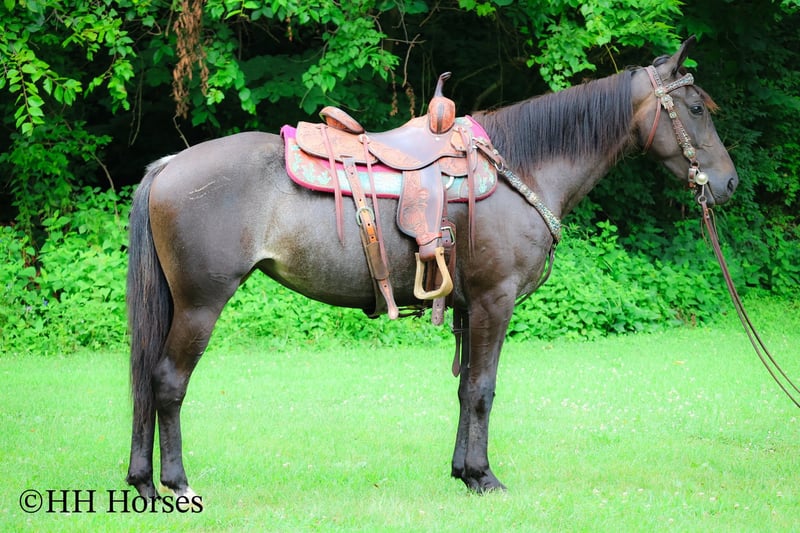 ONLINE AUCTION Place your bids at www.PlatinumEquineAuction.com Starting Bid $3500 Auction ends July 27th 2025 Need a new saddle? Check out White Rock Saddles on our website or Facebook This is “LITRICK’S BLUE MOON”, a gentle REGISTERED BLUE ROAN FRIESIAN SPORT HORSE MARE that is broke to ride and drive. She is a Friesian Morgan cross. This mare is 3 years old and stands 15 hands tall. She is well started and riding and driving very nicely. She is confident, civilized, cool, and calm. This mare has been through the woods, in the deep water, and up and down the mountainous terrain. She has been hauled to state parks for trail riding and will picket line overnight quietly. She stands tied to a trailer, loads, bathes, and hauls with no fuss. She is solid, has an excellent mind, and is not spooky. She is young yet will behave better than most horses twice her age. She walks out nicely relaxed on a loose rein, will lope circles, and stands to harness, hitch, tack, mount, and groom. She has the best temperament, has been ridden and handled by novice riders, and hitched and driven by beginners. She wants to be good, she aims to please, and has been handled daily since birth. Located in Flemingsburg, KY. Contact HH Horses Erin 304-238-4155 with any questions, to make a Buy It Now Offer or to schedule a time to come see her. ONLINE AUCTION Place your bids at www.PlatinumEquineAuction.com Starting Bid $3500 Auction ends July 27th 2025 Need a new saddle? Check out White Rock Saddles on our website or Facebook
