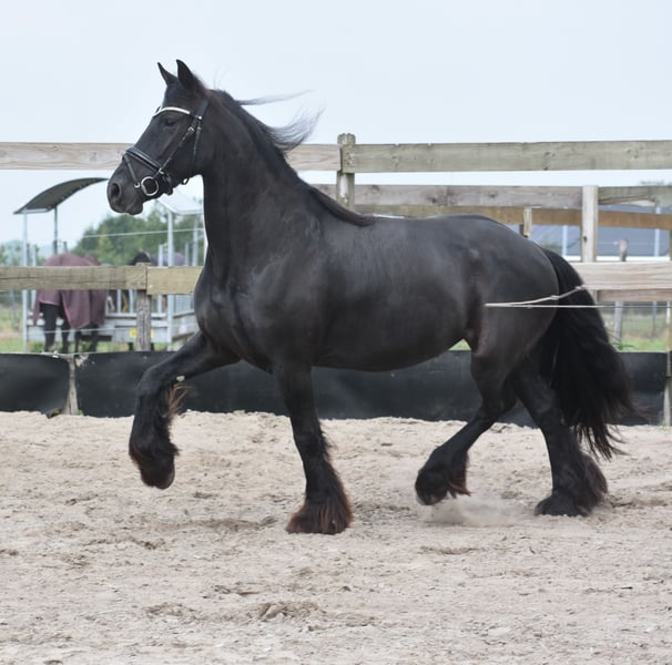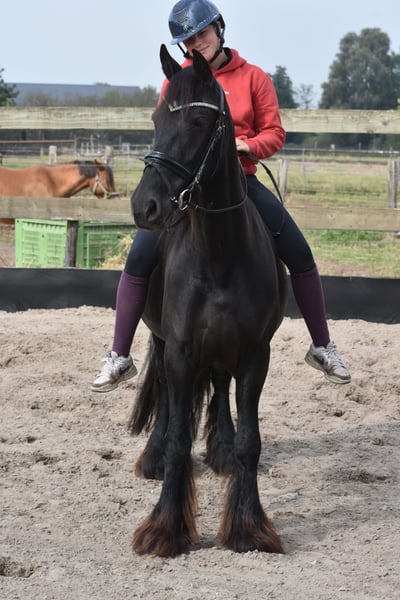 Hübsche, äußerst ehrliche und zu 100 % korrekte Friesenstute Hier ist sie: Marina! (Geburtsname Maria) An ihren ehrlichen, goldenen Blick erkennt man sofort, dass diese Dame äußerst zuverlässig im Charakter ist. Dies ist eines der wenigen Pferde, bei dem wirklich NICHTS zu beanstanden ist. Super ehrlich, ruhig und lieb. Sie verfügt über drei sehr korrekte, elegante, aber dennoch großzügige Gänge, die sie sehr sporttauglich machen. Sie besitzt einen aktuellen Körerungsbericht inklusive Blutprobe, mit dem sie ohne jegliche Einschränkung für den Sport zugelassen wurde! Sie ist völlig frei von Mängeln. Derzeit ca. 1,58 m groß. Marina wurde am 5. Mai 2021 in Spanien geboren! In den Niederlanden hat sie ein Fohlen bekommen. Die Besitzer haben sich entschieden, das Fohlen zu behalten, und so darf Marina in ein liebevolles neues Zuhause ziehen. Sie ist bei ihnen für die Kutsche ausgebildet, siehe Video. Wir reiten sie regelmäßig dressurmäßig und freizeitmäßig, und das klappt hervorragend – sie hat noch keinen falschen Schritt gemacht. Dies ist eine schwarze Perle. Ein Unikat. Preis: 9.750 € inklusive Marken-Weg- und Zaumzeug