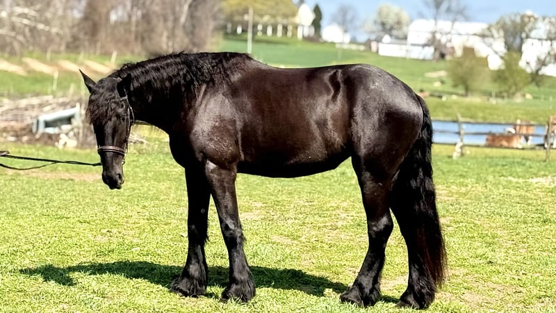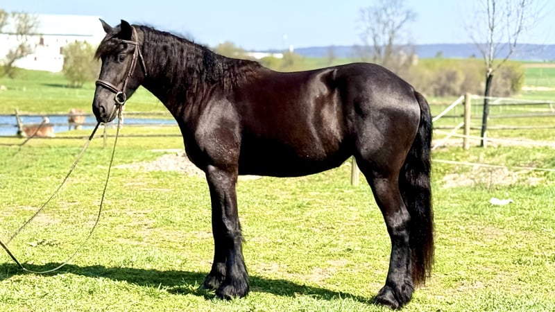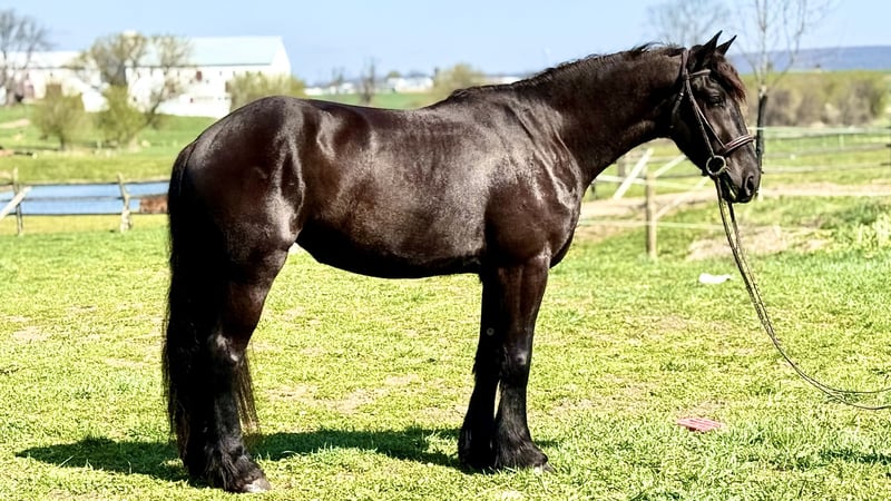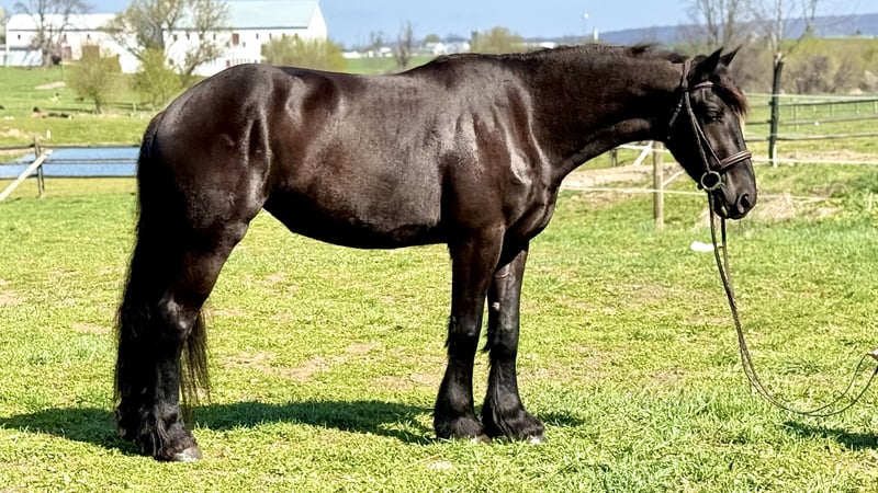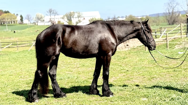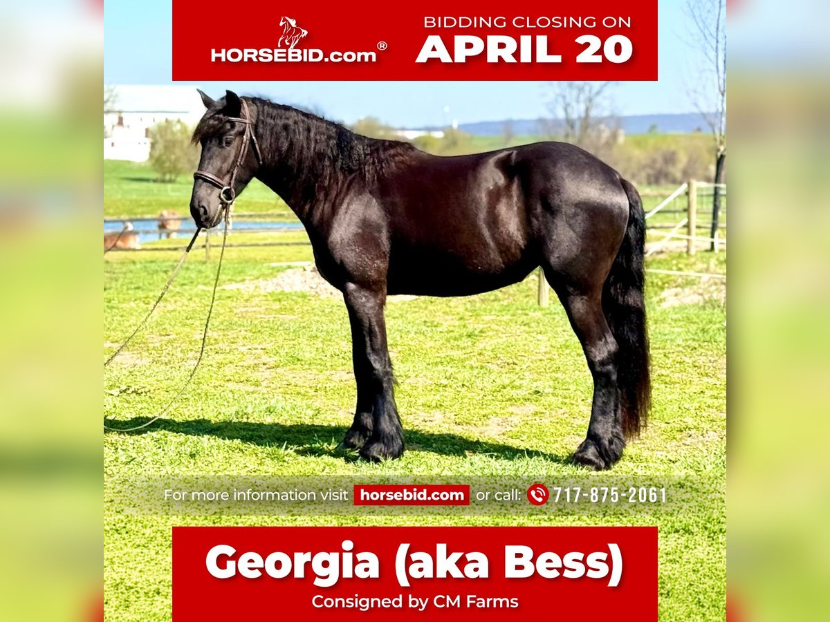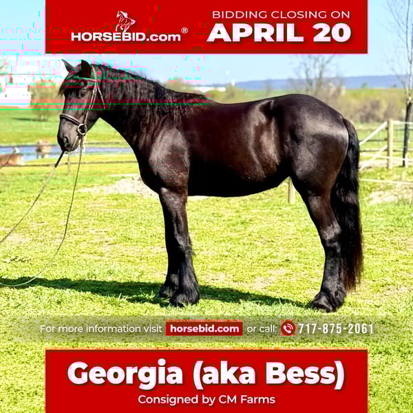 ⚜️𝐭𝐡𝐞 𝓔𝓵𝓲𝓽𝓮 𝐒𝐩𝐫𝐢𝐧𝐠 𝐂𝐥𝐚𝐬𝐬𝐢𝐜⚜️ Happening now thru MONDAY | APRIL 20th - Available EXCLUSIVELY on HorseBid's website! For more details and to register visit: www.Horsebid.com CONSIGNOR CONTACT: CM Farms 717-875-2061 LOCATION: Gap, PA BREED: Friesian/Perch REGISTERED: No REGISTERED NAME: Georgia COLOR: Black HEIGHT: 16 AGE: 4 GENDER: Mare HUSBAND/ FAMILY HORSE DELUXE Meet ✨Georgia!✨ If you’re looking for safe, reliable, the type of horse you can truly trust putting anyone on--don’t miss out on this girl! She is an old soul. “Georgia” (more fondly known around the barn as Bess) is hands down the most people oriented, kid loving, solid citizen we have. This black beauty is a 16-16.1hh, Friesian/Perchx, mare. At the age of four, you might expect some shenanigans- but not with this girl. She carries herself with unflappable confidence, grace, and wisdom well beyond her years. She is the ultimate family/guest horse, whether you have the kids around, or your putting the husband on for his first ride, she’s slow, reliable, and does not have a single mean bone in her body. This girl has a brain that’s rare, hard to come by, and really something special. 💕 On the trail, Bess is the go to for the inexperienced or less confident riders. She’s the type of horse you can pony off another horse with a kid on, or put anyone on and trust that she’ll just follow along. She goes where she’s pointed, whether that be creeks, river, open fields, or bushwhacking through the thicket- she’s always game, and always happy to do her job. There’s nothing that gets under her skin! She’s not winning any races but she’ll follow along happily all day, or step up and go through the scary stuff when the others falter. She has self confidence, an easy way of going, and she’s just a pleasure to have around. In the ring, Bess is a good girl, steady and quiet. She’s never in a rush, never upset, and always willing. She has a lovely uphill way of going, she’s more of a push, and one that will definitely teach to keep leg on! She has a nice walk, trot and canter both ways, and she’s simple and easy. She rides both Western and English, and will even mosey around bareback if she’s asked! She’s been desensitized to everything from traffic and equipment to the tarp dogs the ball- and has pretty much seen everything in be-tween! Her past family even used her to mow the lawn! If that doesn’t tell you the type of brain this beautiful lady has, I don’t know what will! She’s incredible in every way. On the ground, Bess keeps her quiet and sweet demeanor, and she has a big personality! She loves scratches and will even make faces! She comes equipped with a little mustache, a fun curious personality, and most importantly- great ground manners. She stands quiet as a mouse to groom bathe and tack up, and she loads in and out of the trailer quietly. She loves kids, and even loves men so much- she might steal your man’s affection! Everyone that meets her loves her, she’s a complete lovebug and sweetheart with zero vices, and hair for days! If you’ve always wanted a Friesian, but need one with a brain- here she is! We love this girl and can’t wait to see her future. ☺️