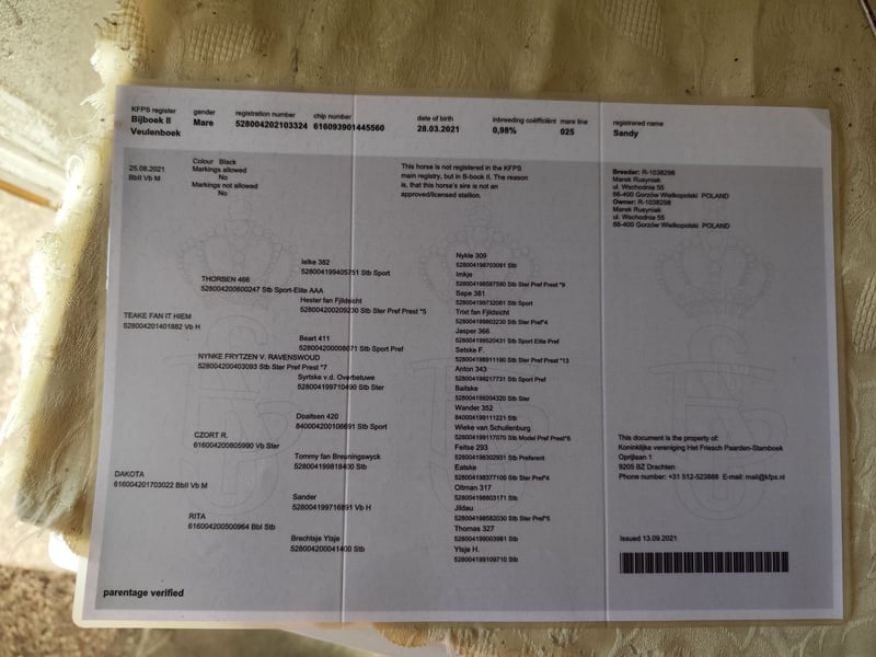 Sprzedam klacz fryzyjska 4 lata Przyjęła jeźdźca (stęp i kłus) do dalszej pracy, była w terenie z innymi końmi. Matka Dakota Ojciec TEAKE FAN IT HIEM Klacz posiada paszport zagranicznych Więcej informacji w wiadomości prywatnej