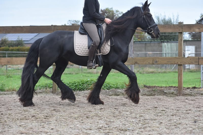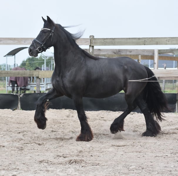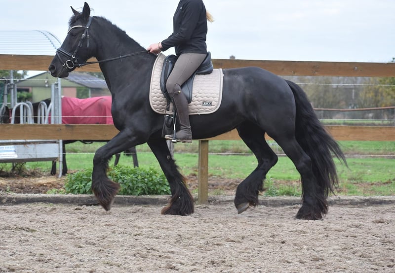 Stunning, exceptionally honest 100% correct Friesian mare Here she is: Marina! (birth name Maria) Her honest, trusting eyes immediately reveal that this mare has an extremely reliable character. This is one of the few horses where there is truly nothing to criticize. Very honest, calm, and sweet. She has three beautifully correct, elevated yet comfortable gaits, making her very suitable for sport. She holds a recent inspection report, including blood test, with approval for sport without any remarks. She is completely free of any faults. Currently approximately 1.58 meters tall. Marina was born on May 5, 2021, in Spain! In the Netherlands, she has had a foal. The owners chose to keep the foal, so Marina is now available to a new loving owner. She has been shown for carriage driving, see the video. We ride her dressage regularly and recreationally, and she performs wonderfully; she has not put a single wrong foot. This is a black pearl. A one in a thousand. €8,750 incl. brand saddle and bridle