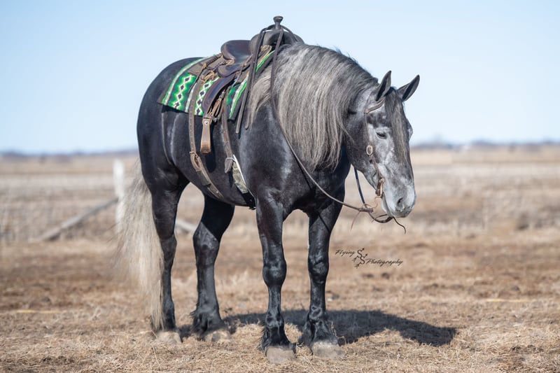 ONLINE AUCTION Place your bids at www.PlatinumEquineAuction.com Starting Bid $3500 Auction ends April 13th, 2025 Need a new saddle? Check out White Rock Saddles on our website or Facebook! If you’re looking for a show stopper, look no further! Kayla is a 5 year old registered Friesian Sporthorse. She is a knockout cross between a Friesian and a Percheron. Kayla stands 16.3 and has conformation that is as beautiful as her gray color. She rides well in the arena and outside on the trails. Kayla is traffic safe, and is used to being around other large and small livestock as well as pets and children! She will ride through an open field, down the trails, across water, through all obstacles, and down busy highways. Kayla will one-hand neck rein or plow rein, she is very soft in the bridle and leg cues. She knows how to side pass, pivot, lope correct circles picking up her leads, open and close gates, can be mounted from a mounting block or fence, and so much more! Kayla is easy to catch and does well in a stall or pasture setting, plus gets along well with other horses. She is quiet, gentle to be around, and so easy to handle. She easily picks up all of her feet, and is good for the farrier. Kayla could go so many directions, and has an excellent foundation to take her there. Whether you want to ride western, english, bareback, or simply trail ride, she is a great fit! Along with all of her experience in western riding, Kayla has been started in dressage and jumping. She is doing great with lead departures and laterals. Kayla moves beautifully, and definitely has a natural talent. She is not for a beginner, but is ready to go any direction in her training. Kayla is a very well rounded mare that will make someone a very high caliber horse! Even with time off, in the pasture or a stall, she rides off great. This outstanding mare has a solid foundation and stays honest whether she is being handled under saddle or on the ground. Kayla is current on Coggins, and also has a current PPE on file. If you have any questions, or would like to meet Kayla prior to the auction ending, please call Edwin Raber 319-283-0616 we are located in Fairbank, IA. ONLINE AUCTION Place your bids at www.PlatinumEquineAuction.com Starting Bid $3500 Auction ends April 13th, 2025 Need a new saddle? Check out White Rock Saddles on our website or Facebook!