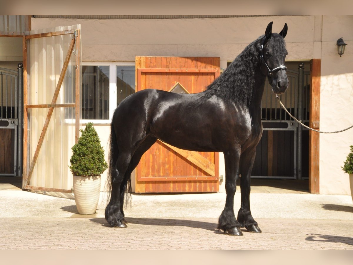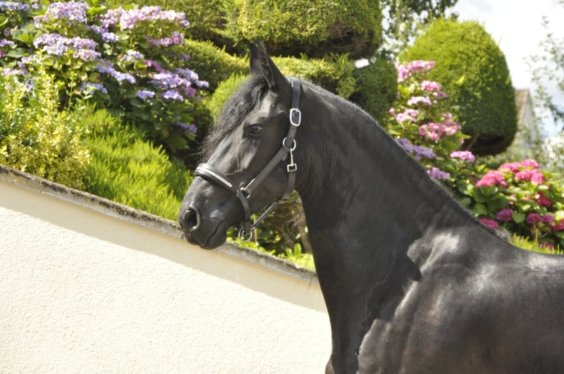 A very sweet and tall Friesian mare from the Netherlands, with a beautiful long mane and tail! She has correct conformation, a stunning small head, and her temperament is simply a dream. She does not exhibit typical mare behavior at all, making her a very pleasant horse to handle. Extremely gentle in her interactions—she is calm and self-assured. Under saddle, she demonstrates a pleasant willingness to work, always responds well, and is fearless. She has been ridden in the three gaits with good manners. If you are looking for an extraordinary and unique mare, here she is. She had her first foal this year, which was very uncomplicated. Additionally, she was a very loving and attentive mother. Please contact us exclusively by phone for inquiries.