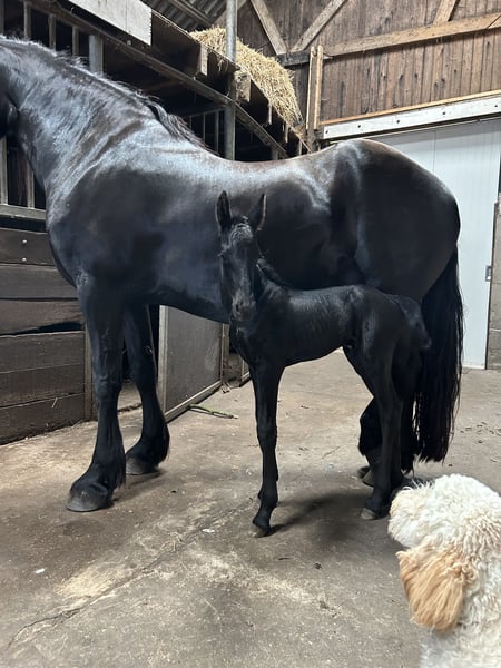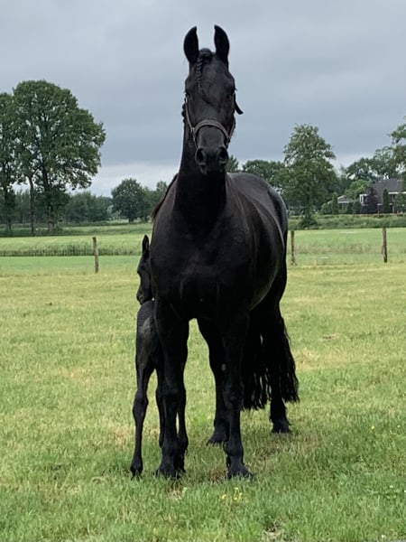 Wunderschöne tiefschwarze Stute mit Hengstfohlen zum Verkauf. Eleganter, ausdrucksvoller Kopf, schöne Gänge und kräftiges Beinteil. Hat bereits vier schöne Fohlen bekommen, von denen das letzte im Kauf inbegriffen ist. Ist leicht zu handhaben und eine gute Mutter. Ist grundausgebildet, steht aber momentan still wegen des Fohlens am Fuß. Inzucht 1,37 Verwandtschaft 18,8 Mutterlinie 049