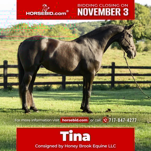 ⚜️𝐓𝐇𝐄 𝐅𝐀𝐋𝐋 𝐇𝐄𝐑𝐈𝐓𝐀𝐆𝐄 𝐂𝐋𝐀𝐒𝐒𝐈𝐂⚜️ Happening now thru MONDAY | NOVEMBER 3rd - Available EXCLUSIVELY on HorseBid's website! For more details and to register visit: www.Horsebid.com CONSIGNOR CONTACT: Honey Brook Equine LLC 717-847-4277 LOCATION: Honey Brook, PA BREED: Friesian REGISTERED: Yes REGISTERED NAME: Miss Tiana COLOR: Black HEIGHT: 17 AGE: 7 GENDER: Mare Meet Tina as we call her,,one that is as well put together as you can find em, and one that has good looks no matter what angle you look at her,, she's got a sweet personality and is the horse that will meet you at the gate and ask what you want of her today!! On the ground Tina is very well mannered and she is good for anyone to lead, and she will stand their all day for you to groom her,as she loves being loved on.. On the trail Tina has miles of experience and crosses any creek,bridge or log that gets in your way,she is happy to go out and explore and she'll stay steady all day, she's one your husband can get on and feel safe on... In the ring Tina has had lots of schooling and has always been willing to try new things,she is very well balanced and has a smooth walk, trot and canter,she moves away from leg pressure and can side pass very well , turn on the forehand,or turn on the haunches without much effort on your part,, also she has been introduced to some obstacles and takes them well... contact us for more information, and also contact us for pictures of x-rays and vet check results....we can help arrange shipping anywhere in the US.