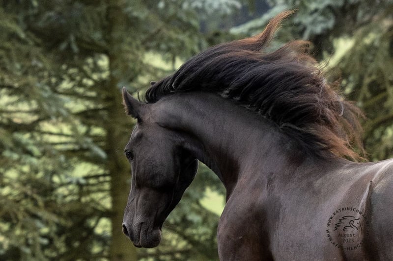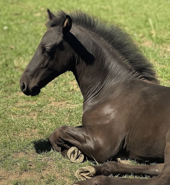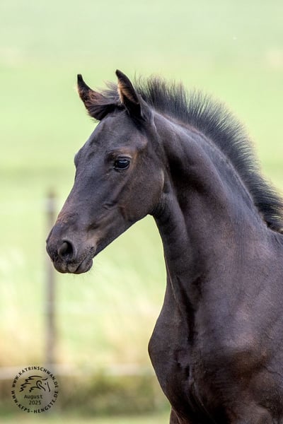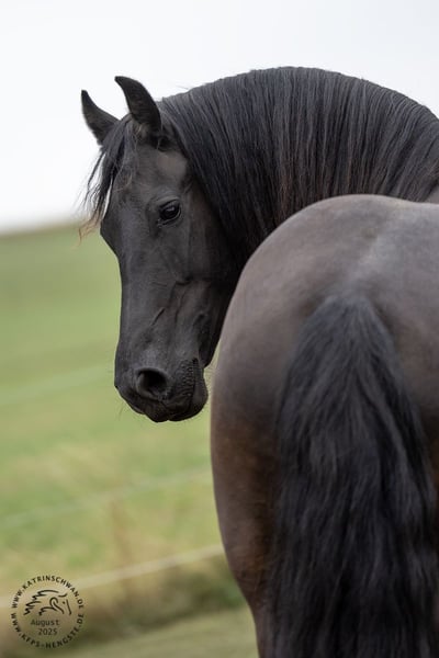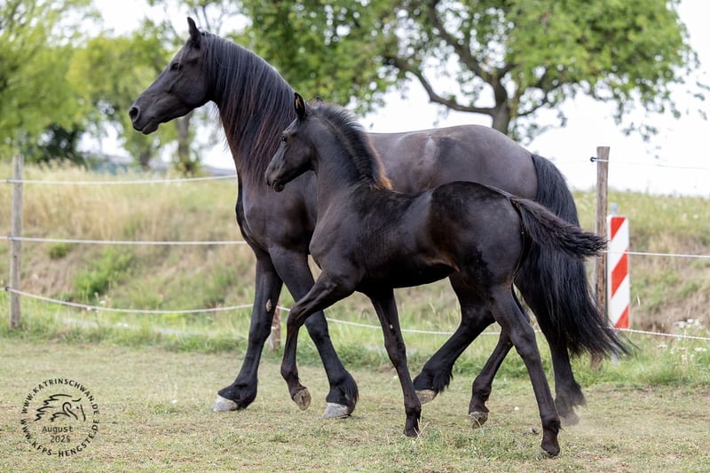 Femke fan E.M.B. Wolter 513 x Waander 512 geboren am 06.05.2025 Dieses bezaubernde, bildschöne, ausdrucksstarke und luxuriöse Stutfohlen sucht sein 5 ⭐️ zu Hause bei Menschen die Femke zu schätzen wissen und entsprechend bereit sind zu fördern! Sie ist freundlich, neugierig, unerschrocken und sehr menschenbezogen. Femke ist hat viel Rassetyp, einen edlen Kopf, ist korrekt gebaut, hat lange, trockene qualitätsvolle Beine sowie eine hervorragende Oberlinie. Der Schritt ist raumgreifend und der Trab zeigt einen guten Hinterhandgebrauch. Im Umgang ist sie, wie ihre Mutter, ein absoluter Schatz. Für die Kenner der Friesenszene: Wolter 513 Sport x Stb. 3. Prämie von Waander 512 x 1. Prämie Ster Sport von Alwin 469 Sport Preferent x 1. Prämie Ster Sport von Fabe 348 Sport Preferent x 1. Prämie Ster Sport Preferent Prestatie von Leffert 306 Sport Preferent Verwandschaft 16.96 Sie stammt aus einer zuchtsicheren Linie, die rassetypische, sportliche und korrekte Friesen hervor bringt. Dadurch ist sie sehr interessant für die Zucht. Aufgrund der sportlichen Erfolge ihrer Zuchtlinie ist zu erwarten das auch Femke im Sport brilliert. Besuch u. kennenlernen jederzeit möglich und auch erwünscht. PS: auf den letzten Bildern ist die Mutter zu sehen
