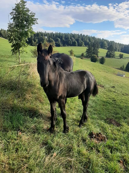 Zu verkaufen ist unser Friesenjunge Flip. Er hat volle Papiere, wurde zur Fohlenschau mit 24 Punkten prämiert und es wurde zur Hengstaufzucht geraten. Flip ist ein munterer, bewegungsfreudiger Jährling, ein schicker, typischer Rassevertreter mit viel Bewegung und Potential. Schick aufgemacht wächst er seit dem Absetzen in unserer Junghengstherde auf und ist daher gut sozialisiert. Vorher war er mit der Mutter in der Fohlenstutenherde auf großen, hügeligen Gelände im Erzgebirge. Er ist altersgemäß roh, kennt Halfter, Anhänger fahren und den Schmied. Er ist regelmäßig entwurmt, verspielt und menschenbezogen. Er kann bei Bedarf weiter in der Herde verbleiben, Seine Mutter ist Vrouwkje Cordes (S1)- MV Epke, MM Hanna BR von Liekele 364 Sein Vater Fritz von Falko.
