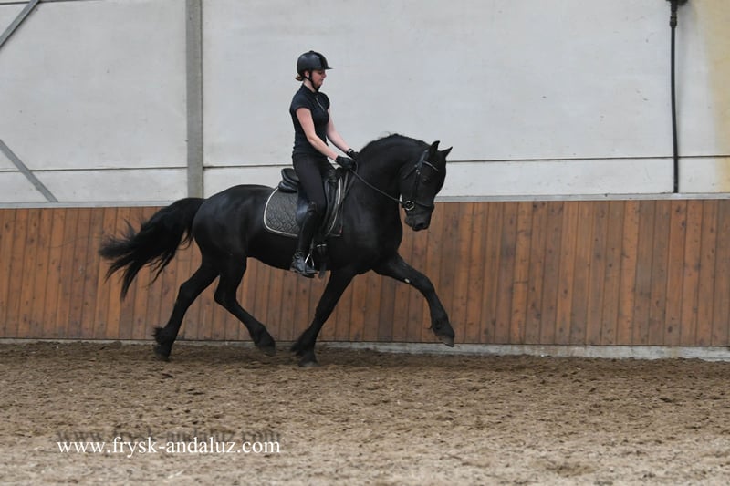 Love at first sight! What an incredibly handsome stallion Tim is. He has an amazing amount of feathering and a huge forelock; just imagine how much this will be as he gets older. Not to mention his movement! Wow wow wow, he gives you goosebumps every time. And then there's his incredibly sweet character; this boy has it all! Tim is a fully papered stallion from the combination of the outstanding sport horse sire Teun 505 Sport AAA x Ielke 382 Sport. His motherline is fully papered: Ster / Ster / Model+Pref – mother of Norbert 444 Sport+Pref / Ster+Preferent, etc. Radiologically, Tim has been found to be in order. Who is going to work with this hunk?! https://www.frysk-andaluz.com/en/horse/tim/